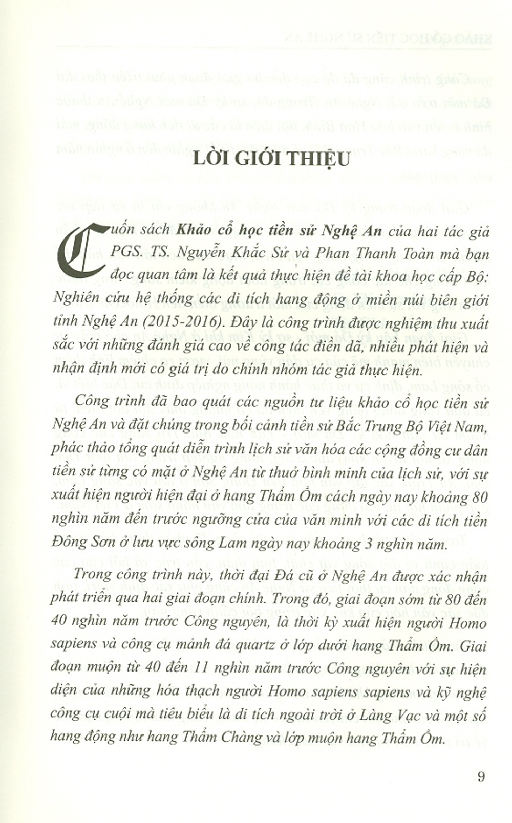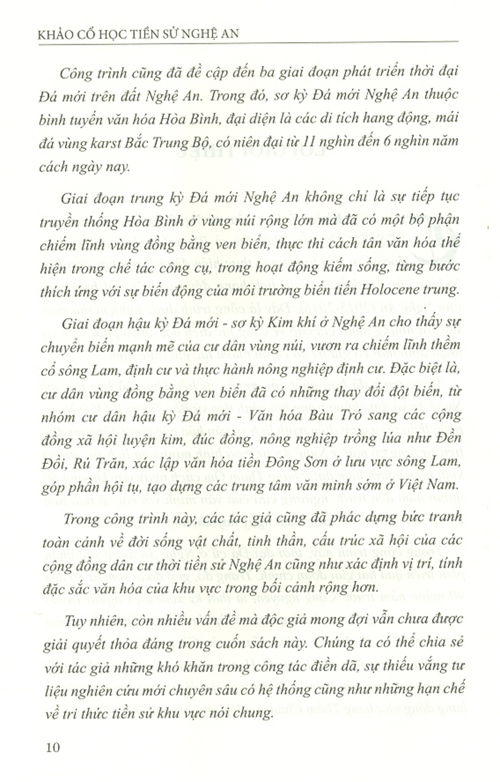 Công trình đã bao quát các nguồn tư liệu khảo cổ học tiền sử Nghệ An và đặt chúng trong bối cảnh tiền sử Bắc Trung Bộ Việt Nam, phác thảo tổng quát diễn trình lịch sử văn hóa các cộng đồng cư dân tiền sử từng có mặt ở Nghệ An từ thuở bình minh của lịch sử, với sự xuất hiện của người hiện đại ở hang Thẩm Ồm cách ngày nay khoảng 80 nghìn năm đến trước ngưỡng cửa của văn minh với các di tích tiền Đông Sơn ở lưu vực sông Lam ngày nay khoảng 3 nghìn nă