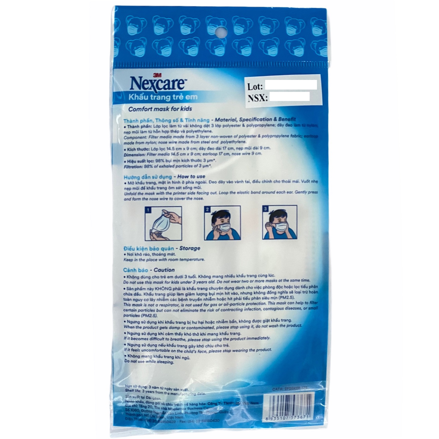 - Tên sản phẩm: Khẩu trang trẻ em chống bụi và kháng khuẩn lọc 98% bụi mịn, vải không dệt mềm mại Nexcare 3M KT-TE1