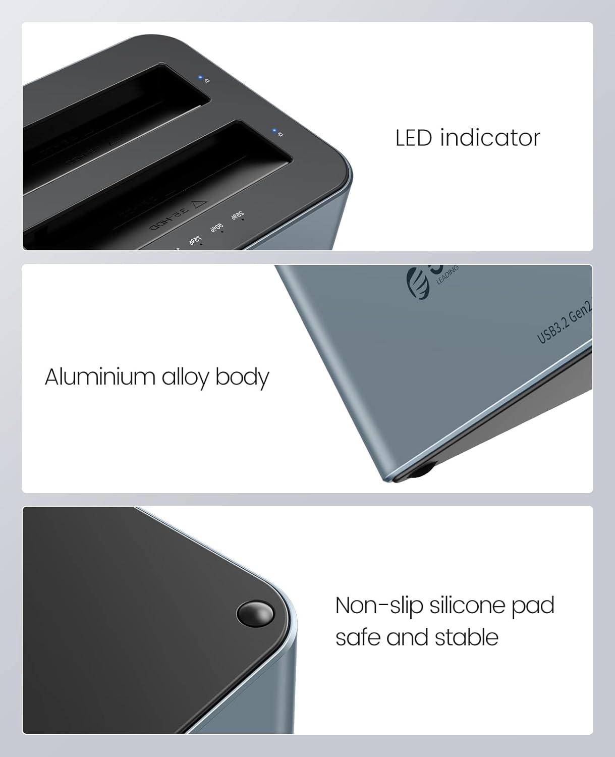 Orico 6626C3-C-V1 có thiết kế hiện đại và chắc chắn với màu xám thời thượng, làm từ chất liệu nhựa ABS bền bỉ, mang đến độ bền cao và khả năng chịu va đập tốt. Docking hỗ trợ hai khe cắm cho các loại ổ cứng 2.5” và 3.5”, cho phép người dùng sao lưu hoặc chuyển dữ liệu giữa hai ổ cứng cùng lúc mà không cần tháo lắp phức tạp. Thiết kế này cũng thân thiện với người dùng, giúp dễ dàng thao tác và bảo vệ ổ cứng khi không sử dụng.