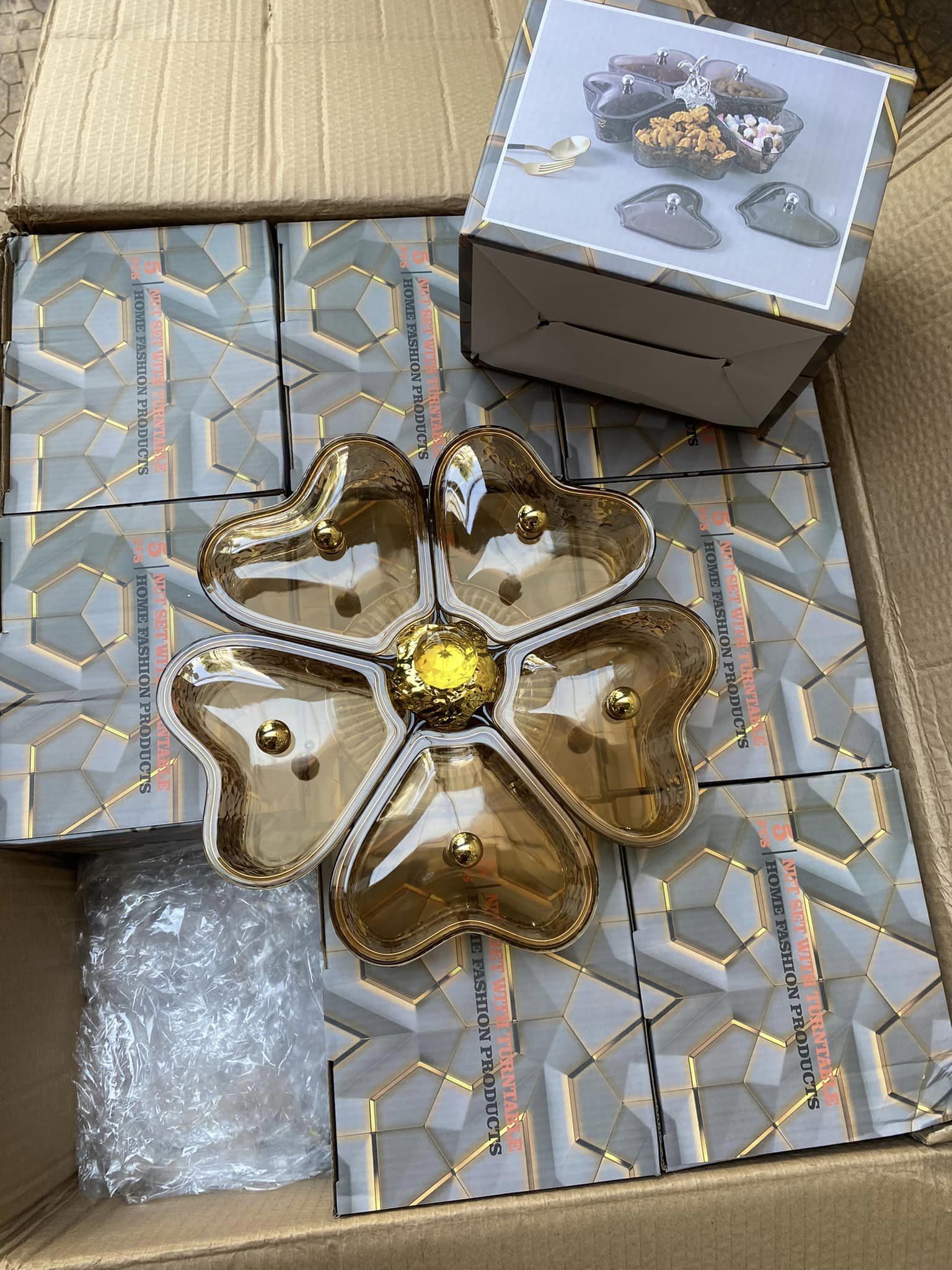 Khay đựng mứt bánh kẹo xoay 5 ngăn hình trái tim, khay đựng trái cây sang trọng Mô tả sản phẩm:- Chất liệu: Nhựa cứng mika- Màu sắc: Vàng hổ phách đẹp - Mẫu giao ngẫu nhiên- Bộ khay bánh kẹo m...