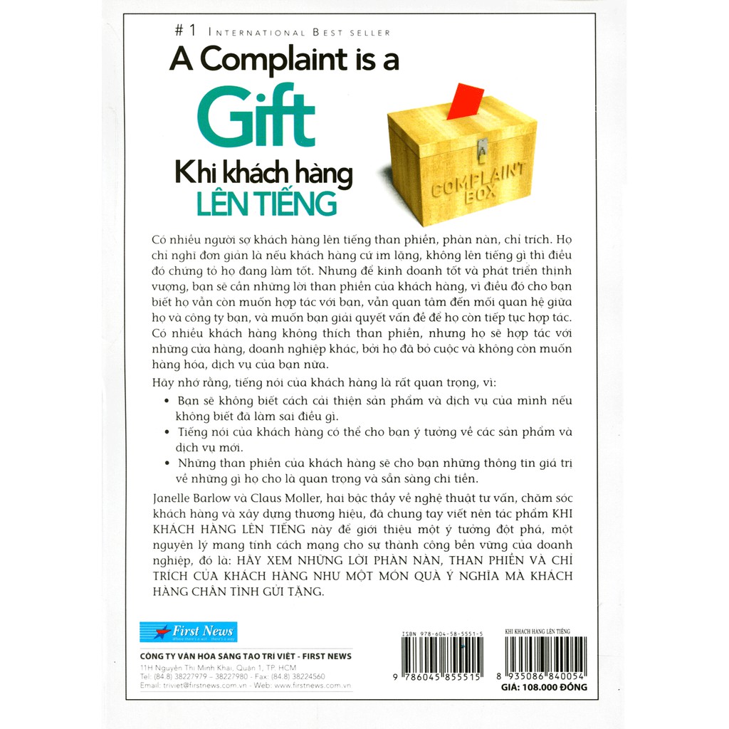Khi Khách Hàng Lên Tiếng Trong cuốn Khi Khách Hàng Lên Tiếng, bậc thầy Janelle Barlow và Claus Moller đã giới thiệu một ý tưởng đột phá mang tính cách mạng: Biến những lời phàn nàn, chỉ trích thành một món quà. Thật vậy, lời phàn nàn của khách hàng là thông tin phản hồi quý báu có thể giúp các doanh nghiệp cải thiện chất lượng sản phẩm, nâng cấp dịch vụ, ứng xử của con người và xác định trọng tâm định hướng sản xuất, kinh doanh, thị trường một cách nhanh chóng, hiệu quả và ít tốn kém nhất. "Ấn bản đầu tiên của quyển sách đã là một viên ngọc quý. Phiên bản mới được cập nhật toàn diện này còn tuyệt vời hơn nữa. Những ví dụ mới vừa mang tính chất chỉ dẫn vừa truyền cảm hứng và thực sự hữu ích cho những người làm công tác chăm sóc khách hàng. Tôi tin rằng quyển sách sẽ gây sửng sốt cho bất cứ ai đang nghi ngờ sức mạnh từ việc lắng nghe khách hàng của mình"