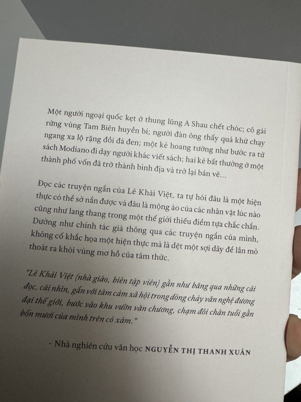 “Lê Khải Việt (nhà giáo, biên tập viên) gần như băng qua những cái đọc, cái nhìn, gắn với tâm cảm xã hội trong dòng chảy văn nghệ đương đại thế giới, bước vào khu vườn văn chương, chạm đôi chân tuổi gần bốn mươi của mình trên cỏ xám.”