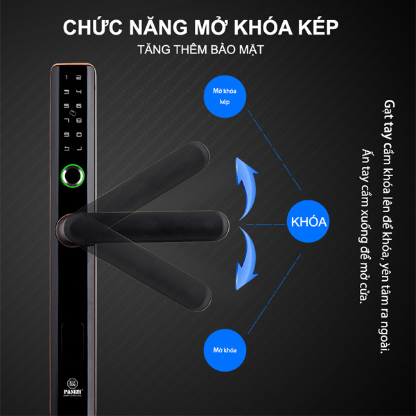 Khóa vân tay cửa nhôm PS01AB35 là lựa chọn hoàn hảo cho khóa điện tử cửa nhôm thế hệ mới, giúp giải quyết các vấn đề khó khăn do khóa cơ mang lại. Phù hợp với gia đình có nhiều thành viên cùng sử dụng. Khóa điện tử hội tụ các công nghệ mới nhất trong lĩnh vực khoá cửa nhôm xingfa. Thiết kế hoàn toàn mới, tay nắm vuông, to bản. Trục tay nắm ngắn phù hợp với nhiều loại cửa, nhất là khoá cửa xingfa. Khóa vân tay cửa nhôm PASINI PS01AB35 màu đen (Gem Black) Mở cửa từ xa qua wifi Khóa vân tay dành cho cửa nhôm kính Pasini có tay cầm nhỏ gọn, trục tay nắm ngắn, khả năng chống nước. Được trang bị lõi khóa cấp C, độ an toàn tuyệt đối. Với nhiều phương thức mở khóa như mở khóa bằng vân tay, mở khóa bằng mật khẩu, mở khóa bằng thẻ từ, mở khóa bằng chìa cơ. Đặc biệt là mở từ xa qua ứng dụng wifi giúp cho cuộc sống bạn tiện lợi và thông minh hơn. Khóa vân tay cửa nhôm PASINI ứng dụng app tuya mở cửa linh động cho người dùng Khóa vân tay cửa nhôm PASINI với tính năng nổi bật Công nghệ thẻ từ cảm ứng Thẻ từ cảm ứng nhỏ gọn, dễ dàng mang theo, có thể sao chép nhiều thẻ. Công nghệ mã hóa giải quyết hiệu quả vấn đề mở khóa tạm thời cho người thân, bạn bè. Khóa thông minh sử dụng công nghệ cảm ứng thẻ từ Nhận dạng vân tay Công nghệ nhận dạng vân tay bán dẫn, chíp nhận dạng và thu thập dấu vân tay bán dẫn tien tiến. Từ chối dấu vân tay giả và dấu vân tay nhân bản Khóa vân tay cửa nhôm PASINI sử dụng công nghệ nhận dạng vân tay siêu nhạy Mật khẩu ảo Khi nhập mật khẩu, bạn chỉ cần nhập những con số bất kỳ nào trước và sau mật khẩu chính xác của bạn. Hệ thống sẽ tự động nhận diện mật khẩu, mật khẩu ảo lên tới 10 số, chỉ cần nhập đúng 6 số mật mã liền trong dãy số. Chống xem trộm mật mã, gúp an toàn hơn. Khóa vân tay cửa nhôm PASINI dùng mật khẩu ảo Chất liệu bề mặt bẳng công nghệ IML Hợp kim cao cấp, chạm khắc toàn bộ trên máy CNC, công nghệ sơn bên trong IML, chống mài mòn và chống trầy xước. Công nghệ mạ oxy hóa giúp bền màu 10 năm như mới Khóa vân tay cửa nhôm PASINI sử dụng chất liệu bề mặt bằng công nghệ IML Chức năng mở khóa kép Khóa vân tay cửa nhôm PASINI PS01AB35 chức năng mở khóa kép tăng thêm bảo mật. Gạt tay cầm khóa lên để khóa, yên tâm ra ngoài, ấn tay cầm xuống để mở cửa. Khóa vân tay cửa nhôm PASINI công nghệ mở khóa kép Thân khóa bằng théo không gỉ Thân khóa dùng cho khóa điện tử Pasini sử dụng chất liệu thép không gỉ 304 cao cấp, chống han rỉ, chống mài mòn cực tốt, độ bền cao, đảm bảo an toàn hơn cho người dùng. Thân khóa lưỡi móc đôi, ứng dụng rộng rãi, có thể sử dụng cho các loại cửa kính, cửa phẳng, cửa trượt. Khóa vân tay cửa nhôm PASINI thân khóa bằng thép không gỉ Nắp đậy lõi khóa chống khoan Để ngăn chặn kẻ trộm phá hủy lõi khóa, tăng cường độ an toàn cho khóa. Khóa vân tay cửa nhôm PASINI PS01AB35 thiết kế nắp đậy lõi khóa chống khoan an toàn hơn, nắp đậy lõi khóa bằng chất liệu thép không gỉ, chống khoann cắt. Khóa vân tay cửa nhôm PASINI nắp đậy lõi khóa chống khoan Hai màu lựa chọn Khóa vân tay cửa nhôm PASINI PS01AB35 được thiết kế sang chảnh với hai màu đen và bạc Khóa vân tay cửa nhôm PASINI thiết kế sáng chảnh với 2 màu đen và màu bạc Phối cảnh khóa vân tay cửa nhôm PASINI PS01AB35 Khóa vân tay cửa nhôm PASINI PS01AB35 màu đen Nhiều phương thức mở cửa khoá điện tử cửa nhôm PS01AB35 đa dạng phương thức mở khóa: mở bằng vân tay, mở bằng mật mã, mở bằng thẻ từ, mở bằng chìa cơ, mở bằng app tuya, giúp thuận lợi dễ dàng khi sử dụng. Thiết kế thân thiện với người dùng, làm cho cuộc sống ngày càng đơn giản hơn. Khóa vân tay cửa nhôm PASINI đa dạng phương thức mở khóa Thân khóa vân tay cửa nhôm PASINI PS01AB35 Khóa cửa nhôm sử thích hợp với ba loại thân khóa: Thân khóa thép không gỉ chốt xiên 3585, thân khóa thép không gỉ móc đôi 3585 và thân khóa thép không gỉ đa điểm 33585. Độ an toàn nâng cấp, lõi khóa cấp C, thân khóa chống va đập. Khóa vân tay cửa nhôm PASINI sử dụng thân khóa 3585 Thông số cơ bản sản phẩm Khóa vân tay cửa nhôm PASINI thông số kỷ thuật   Tên sản phẩmKhóa vân tay cửa nhôm PASINI PS01AB35 màu đenMã sản phẩmPS01AB35Chất liệuHợp kim nhôm cao cấpChất liệu lõi khóaĐồng nguyên chấtThân khóaInox 304 tiêu chuẩn 3585Màu hoàn thiệnMàu đen (Gem Black)Kích thước (RxCxS)Mặt ngoài: 37 x 290 x 20mmCửa thích hợpHệ nhômKhoảng cách từ tâm85mmĐộ dày đố cửa30mm – 75mmDung lượng lưu trữ300 vân tay, thẻ, mật khẩuNguồn làm việcPin kiềm DC 6V 4 pin AAACảnh báo pin yếu<3.6VNguồn sạc khẩn cấpNguồn dự phòng Micro USB 5VTrọn bộ gồmBộ khóa, 3 thẻ từ, 2 chìa khóa cơ Khóa vân tay cửa nhôm PASINI PS01AB35 cực kỳ phù hợp với các loại cửa và hệ nhôm. Vừa tiện lợi, dễ sử dụng, vừa góp phần tăng vẻ đẹp sang trọng cho ngôi nhà bạn.