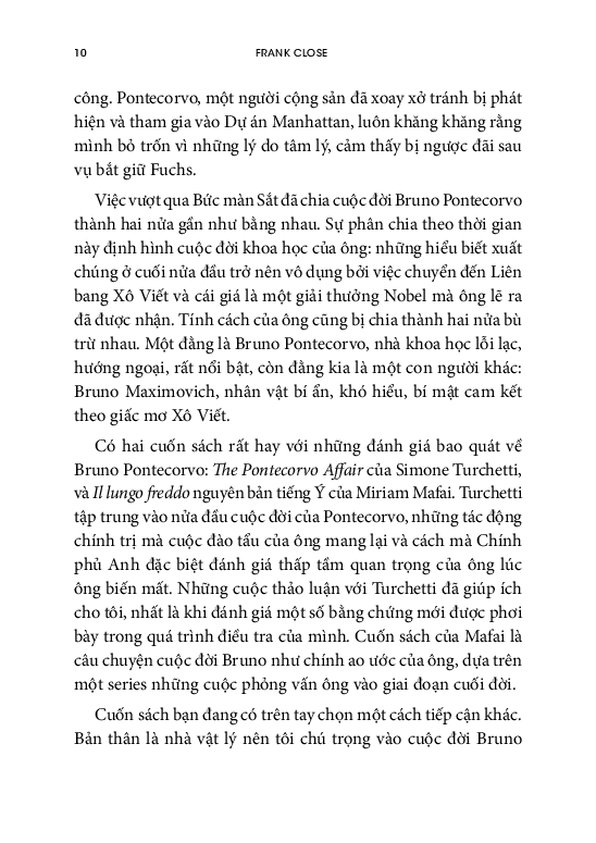 Trong Nhà vật lý hay điệp viên, Frank Close cung cấp cho độc giả những điều từ trước đến nay chưa được kể về cuộc sống của Pontecorvo, dựa trên những tài liệu từ gia đình và bạn bè của Pontecorvo và các nhà khoa học Nga mà sau này ông làm việc. Cuốn sách là một góc nhìn chi tiết về cuộc sống của Pontecorvo trong sự hấp dẫn của một câu chuyện về gián điệp. Một điệp viên, một vụ bắt cóc, cuốn sách này là lịch sử của vật lý hạt nhân với tất cả sự bí ẩn của nó.