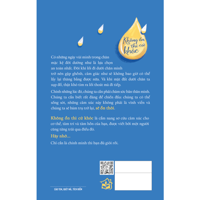 Không Ổn Thì Cứ Khóc Đây là cuốn sách viết về sức khỏe tinh thần, hướng dẫn đ.i.ề.u t.r.ị, tự chăm sóc bản thân dành cho những ngày bạn cảm thấy cô đơn, những ngày mọi sự tan vỡ hoặc quá bất lực, xuống tinh thần. Với cách suy nghĩ thấu cảm, hài hước và trung thực, tác giả đề ra những giải pháp, hướng dẫn giúp bạn tìm ra con đường trở về với chính mình. Cho dù bạn đang có một ngày tồi tệ hay một chuỗi ngày tồi tệ tưởng chừng kéo dài vô tận, “Không ổn thì cứ khóc” là cẩm nang sơ cứu cảm xúc cho cơ thể, tâm trí và tâm hồn của bạn, được viết bởi một người cũng từng trải qua điều đó.