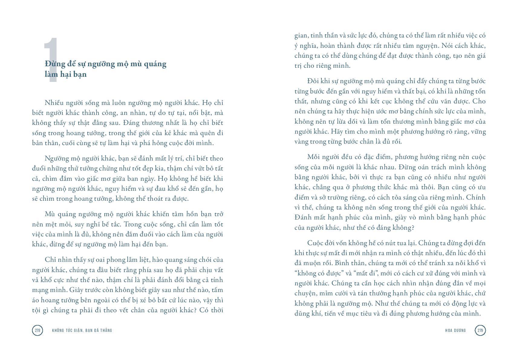 Không tức giận, bạn đã thắng sẽ cùng bạn đi sâu vào từng ngóc ngách cảm xúc, thấu rõ mọi nấc thang của cơn giận. Từ đó, tìm ra điểm cân bằng cho tâm trạng, xoay chuyển thái độ và mài giũa khả năng kiềm chế cảm xúc, trở thành viên kim cương quý giá dưới những áp lực cuộc đời.