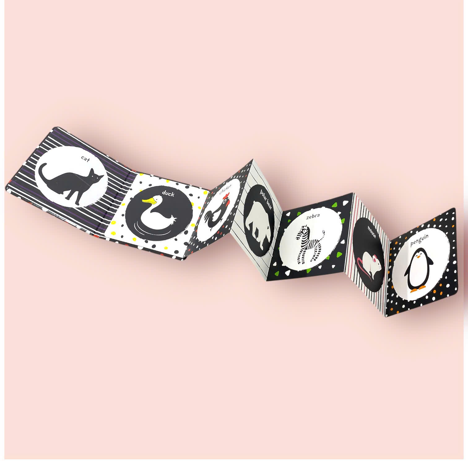 Thiết kế zigzag độc đáo : Cuốn sách được thiết kế dạng zigzag với các trang bìa cứng, cán bóng dày dặn, và bo góc tròn an toàn, bé thỏa sức khám phá mà không lo làm hỏng. Bé có thể chơi đùa với sách, kéo dài ra như một chuỗi hình ảnh hấp dẫn hoặc đặt quanh giường, cũi, nôi để quan sát.