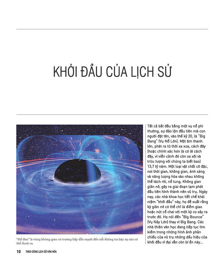 - Bạn có biết mười giai đoạn then chốt trong quá trình phát triển của loài người, của y học và lịch sử khoa học? Theo dòng lịch sử văn hóa sẽ giúp bạn khám phá hoặc khám phá lại tất cả các khái niệm quan trọng nhất về văn hóa: những thần thoại quan trọng, những trào lưu văn học lớn nhất, những hệ thống triết học chủ đạo và những người sáng lập, những khám phá cơ bản, những kỷ lục khó tin nhất, những nghệ sĩ tiêu biểu nhất, những khái niệm then chốt của khoa họ Nhờ bức tranh toàn cảnh tổng hợp về những sự kiện lớn, những phát minh làm thay đổi thế giới, những nhân vật nổi bật, bạn sẽ biết mọi thứ về nghệ thuật và văn học, điện ảnh và thể thao, lịch sử và địa lý qua từng thế kỷ. TÁC GIẢ: Isabelle Fougère là nhà báo và nhà văn tự do người Pháp đã cộng tác với nhiều tờ báo, tạp chí, và kênh truyền hình lớn như Arte, TV5 Monde, France Culture hay Le Figaro Magazine. Cô là tác giả của nhiều cuốn sách phi hư cấu, tiểu luận và sách cho trẻ em, trong đó có Lại là các câu hỏi vì sao và Vì sao? thuộc xê ri “Hỏi đáp cùng em”. Cô đồng sáng lập và tổ chức giải Canon dành cho nữ phóng viên ảnh tại lễ hội Visa pour l'image, do Hiệp hội các nhà báo nữ trao tặng và Tạp chí Figaro hỗ trợ. Ngoài ra, cô còn dành nhiều năm hoạt động vì nhân quyền và phụ nữ. "