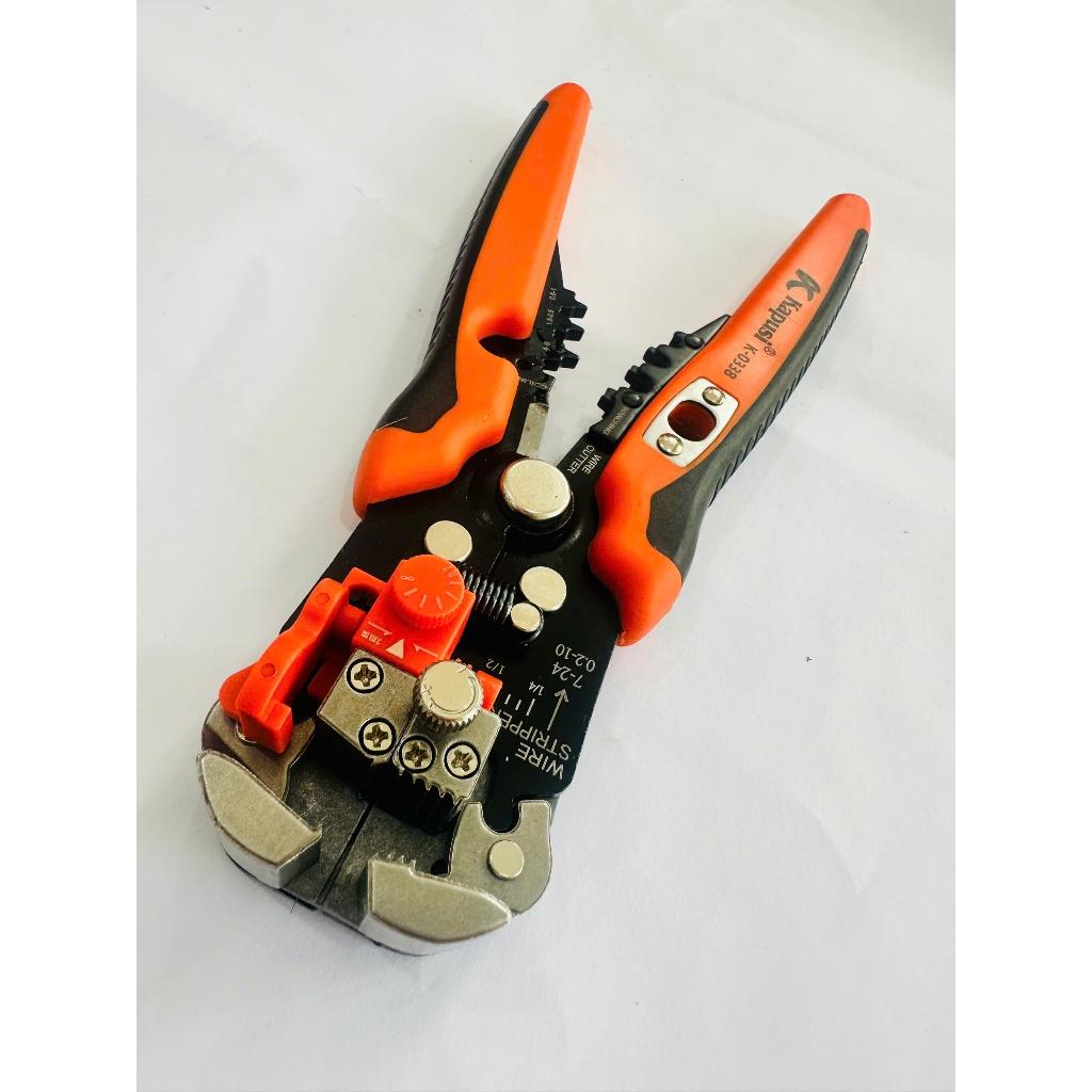 Kìm tuốt dây đa năng Kapusi K-0338 là công cụ chuyên dụng giúp tuốt vỏ dây điện, cắt dây và bấm cos nhanh chóng, chính xác.