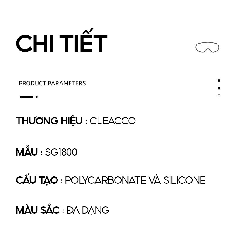Mua tại TiktokKính Bơi Trẻ Em Cleacco SG1800 Kính Bơi Cho Trẻ Em Chuyên Dụng CLEACCO được thiết kế đặc biệt không chỉ bảo vệ đôi mắt của trẻ trong khi bơi mà còn là một phụ kiện bơi lội đẹp mắt mà các bậc phụ huynh có thể dành tặng cho con em mình. Chất liệu nhựa cứng Polycarbonat cùng lớp phủ chống mờ và tia UV giúp trẻ có được tầm nhìn tốt trong khi bơi. Dây đeo cùng vành silicone mềm dẻo, bảo vệ vùng mắt khỏi nước cũng như mang đến cảm giác dễ chịu, không tạo vết hằn hay cấn. Chuyên dụng cho trẻ em từ 3-15 tuổi Thiết kế đẹp, ôm sát mắt, tránh nước vào bảo vệ mắt Tròng kính chống trầy xước, cực rõ nét, độ tinh khiết cao Chất liệu: kính được làm từ vật liệu PC nhập khẩu và silicone có độ bền cao. Kính sử dụng nguyên liệu ổn định UV siêu chống tia cực tím và công nghệ cao xử lý tránh sương mù cho mắt kính. Chất liệu dây và vòng đệm bằng silicone, chất liệu tròng kính là polycarbonate Màu sắc: Hồng, xanh Dây đeo và cầu nối có thể thay đổi được, dây đeo mềm không gây đau khi đeo và giúp cho kính không bị trượt ra bên ngoài khi bơi hay lặn. Mặt kính rõ nét thoải mái bơi lội ngoài trời Gọng kính dẻo tránh gãy, rất bền với độ xoắn cao