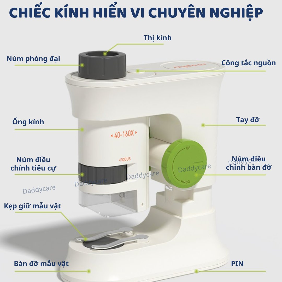 - PHÓNG ĐẠI 160 LẦN: Với độ phóng đại từ 40x đến 160x, kính hiển vi giúp trẻ khám phá thế giới vi mô một cách chi tiết và sinh động.