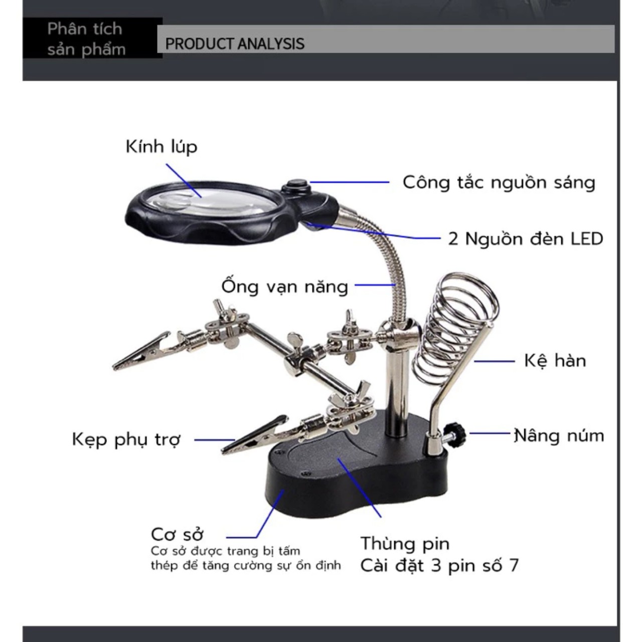 Khung kẹp và các chi tiết được thiết kế chắc chắn, giúp giữ cố định mạch điện tử một cách an toàn. 2. Đèn LED Sáng:
