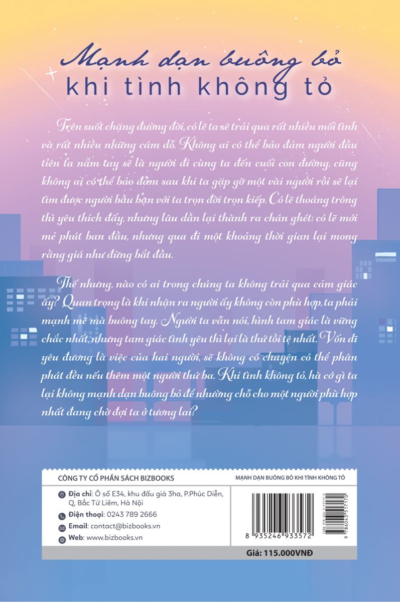 Bình yên là khi chúng ta biết buông đúng lúc, bỏ đúng người Một cuộc tình tốt đẹp thì nhất định phải có sự thỏa hiệp lẫn nhau. Con người không phải các mảnh ghép, không phải sinh ra đã khuyết mất một mảnh và đợi chờ mảnh còn lại đến để bổ lấp. Con người ấy mà, đều có tính cách và những yêu thích riêng, nhưng bằng lòng vì nhau mà liên tục mài cho bản thân tròn vành, thì lúc ôm chầm mới có thể sưởi ấm và không làm đau đớn lẫn nhau. Cuốn sách Mạnh dạn buông bỏ khi tình không tỏ là cuốn sách viết về những cảm xúc trong tình yêu của những người trẻ. Ta như thấy mình qua những cảm xúc chông chênh, lên bổng xuống trầm của thời thanh xuân. Người ta cứ sợ đau nhưng không hề biết rằng, nỗi đau dai dẳng bấy lâu nay họ chịu đựng còn lớn hơn thế gấp nhiều lần. Hãy mạnh dạn buông bỏ, đừng cứ mãi cố chấp níu giữ những gì không xứng đáng. Trên suốt chặng đường đời, cõ lẽ ta sẽ trải qua rất nhiều mối tình và rất nhiều những cám dỗ. Không ai có thể bảo đảm người đầu tiên ta nắm tay sẽ là người đi cùng ta đến cuối con đường, cũng không ai có thể đảm bảo sau khi ta gặp gỡ một vài người rồi sẽ lại tìm được người bầu bạn với ta trọn đời trọn kiếp. Có lẽ thoáng trông thì yêu thích đấy, nhưng lâu dần lại thành ra chán ghét; có lẽ mới mẻ phút ban đầu, nhưng qua đi một khoảng thời gian lại mong rằng giá như chưa từng bắt đầu. Thế nhưng, nào có ai trong chúng ta không phải trải qua cảm giác ấy? Quan trọng là khi nhận ra người ấy không còn phù hợp, ta phải mạnh mẽ buông tay. Người ta vẫn nói, hình tam giác là vững chắc nhất, nhưng tam giác tình yêu thì lại là thứ tồi tệ nhất. Vốn dĩ yêu đương là việc của hai người, sẽ không có chuyện có thể phân phát đều nếu thêm một người thứ ba. Khi tình không tỏ, hà cớ gì ta lại không mạnh dạn buông bỏ để nhường chỗ cho một người phù hợp nhất đang chờ đợi ta ở tương lai? Người ta cứ sợ đau nhưng không hề biết rằng, nỗi đau dai dẳng bấy lâu nay họ chịu đựng còn lớn hơn thế gấp nhiều lần. Hãy mạnh dạn buông bỏ những thứ không thuộc về ta. Mạnh mẽ lên cô gái, nói lời chia tay đi, nỗi đau này đã đến lúc kết thúc rồi. Trích dẫn hay trong Mạnh dạn buông bỏ khi tình không tỏ "Nguyên nhân dẫn đến một mối quan hệ trở nên nhạt đi, chẳng qua là, một người không nói, một người không hỏi, càng huống chi hỏi rồi cũng không chịu nói" "Thích một người, khởi đầu với nhan sắc, lún sâu với tài năng, trung tình với nhân phẩm" "Con người ấy mà, đều có tính cách và những yêu thích riêng, nhưng bằng lòng vì nhau mà liên tục mài cho bản thân tròn vành, thì lúc ôm chầm mới có thể sưởi ấm và không làm đau đớn lẫn nhau"