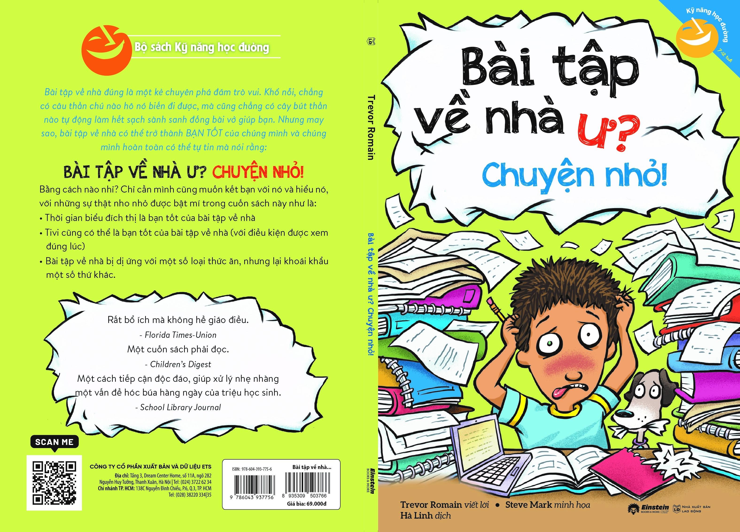 - Trong khi bài tập về nhà, bài kiểm tra và cách sắp xếp là các vấn đề có phần hiển hiện rõ về cách học tập, thì vấn nạn học đường mang tính tâm lý nhiều hơn và hiện cũng được nhiều phụ huynh/nhà trường quan tâm. Thông Tin Sản Phẩm: Tác phẩm: Bài Tập Về Nhà Ư? Chuyện Nhỏ! Tác giả: Trevor Romain viết lời, Steve Mark minh họa Dịch giả: Hà Linh Khổ: 13x19 Số trang: 88 Trang Nhà Phát Hành: ETS Nhà Xuất Bản: NXB Lao Động Gooda tin rằng cuốn sách sẽ mang lại kiến thức thật bổ ích cùng những trải nghiệm thật tuyệt vời, hy vọng đây sẽ là 1 cuốn sách quý trên kệ sách của bạn! QUYỀN LỢI KHÁCH HÀNG KHI MUA SÁCH TẠI SHOP GOODA THƯ VIỆN SÁCH QUÝ: