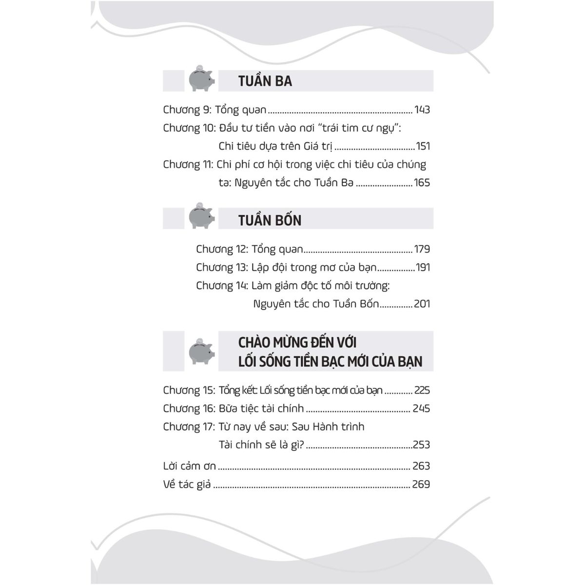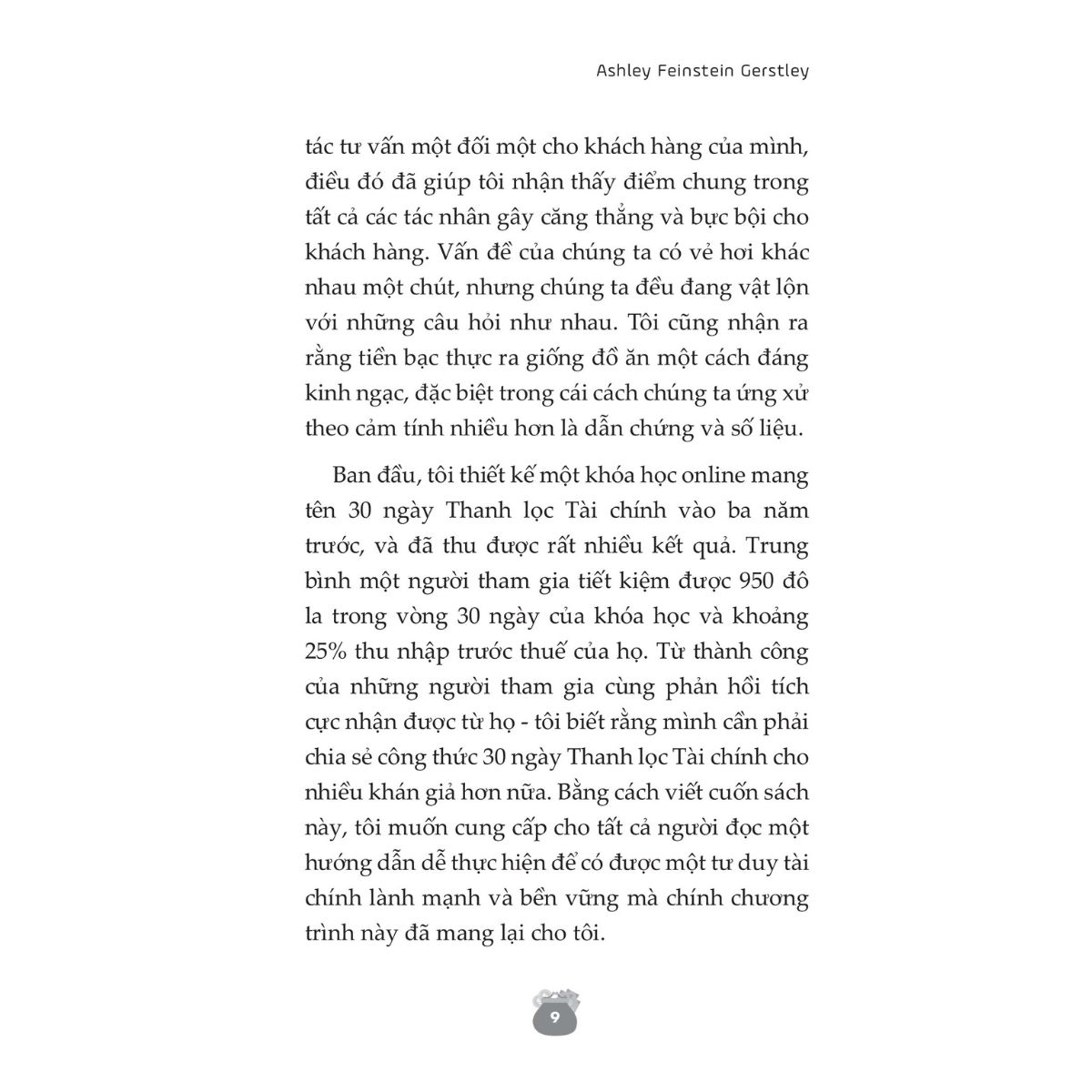 Bằng chương trình Thanh lọc Tài Chính trong 30 ngày, Kỹ năng lập kế hoạch và quản lý tài chính cá nhân trong 30 ngày giúp bạn định hình lại cách chi tiêu, thay đổi tư duy về tiền bạc và đảm bảo phương pháp quản lý tài chính cá nhân hiệu quả. Cuốn sách chính là cứu cánh cho mối quan hệ không mấy tốt đẹp của bạn với tiền bạc và giúp bạn vạch ra một kế hoạch chi tiêu để có thể vẫn vui vẻ mà không tốn kém. Lối tư duy tích cực và đúng đắn về tiền bạc mà tác giả đưa ra sẽ nhanh chóng hỗ trợ bạn hoàn thành các mục tiêu mà bạn mong muốn nhất trong đời.