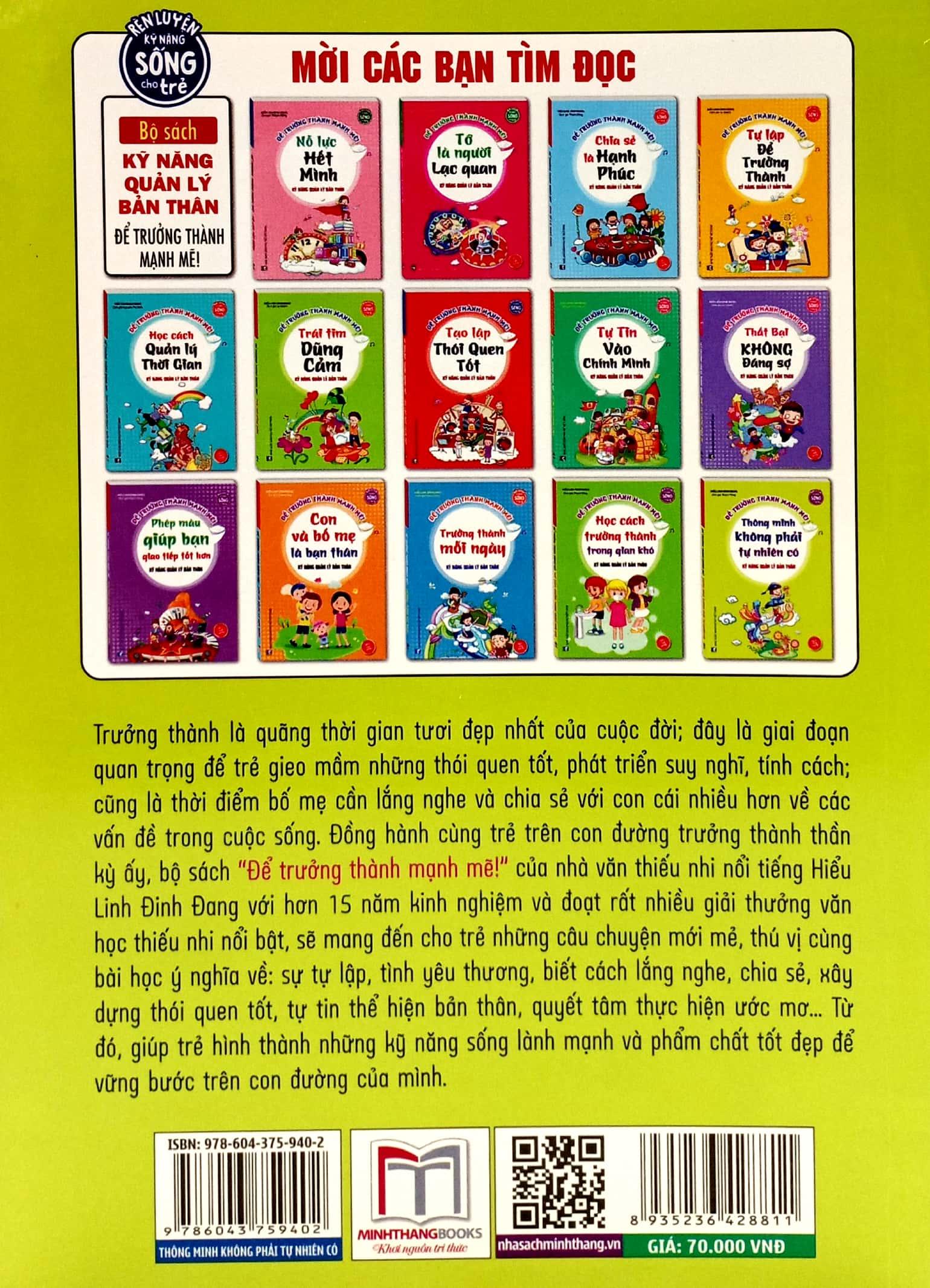 Trưởng thành là quãng thời gian tươi đẹp nhất của cuộc đời , đây là giai đoạn quan trọng để trẻ gieo mầm những thói quen tốt , phát triển suy nghĩ , tính cách ; cũng là thời điểm bố mẹ cần lắng nghe và chia sẻ với con cái nhiều hơn về các vấn đề trong cuộc sống . Đồng hành cùng trẻ trên con đường trưởng thành thần kỳ ấy , bộ sách "Để trường thành mạnh mẽ!" của nhà văn thiếu nhi nổi tiếng Hiểu Linh Đinh Đang với hơn 15 năm kinh nghiệm và đoạt rất nhiều giải thưởng văn học thiếu nhi nổi bật , sẽ mang đến cho trẻ những câu chuyện mới mẻ , thú vị cùng bài học ý nghĩa về : sự tự lập , tình yêu thương , biết cách lắng nghe , chia sẻ , Từ đó , giúp trẻ hình thành những kỹ năng sống lành mạnh và phẩm chất tốt đẹp để vững bước trên con đường của mình .