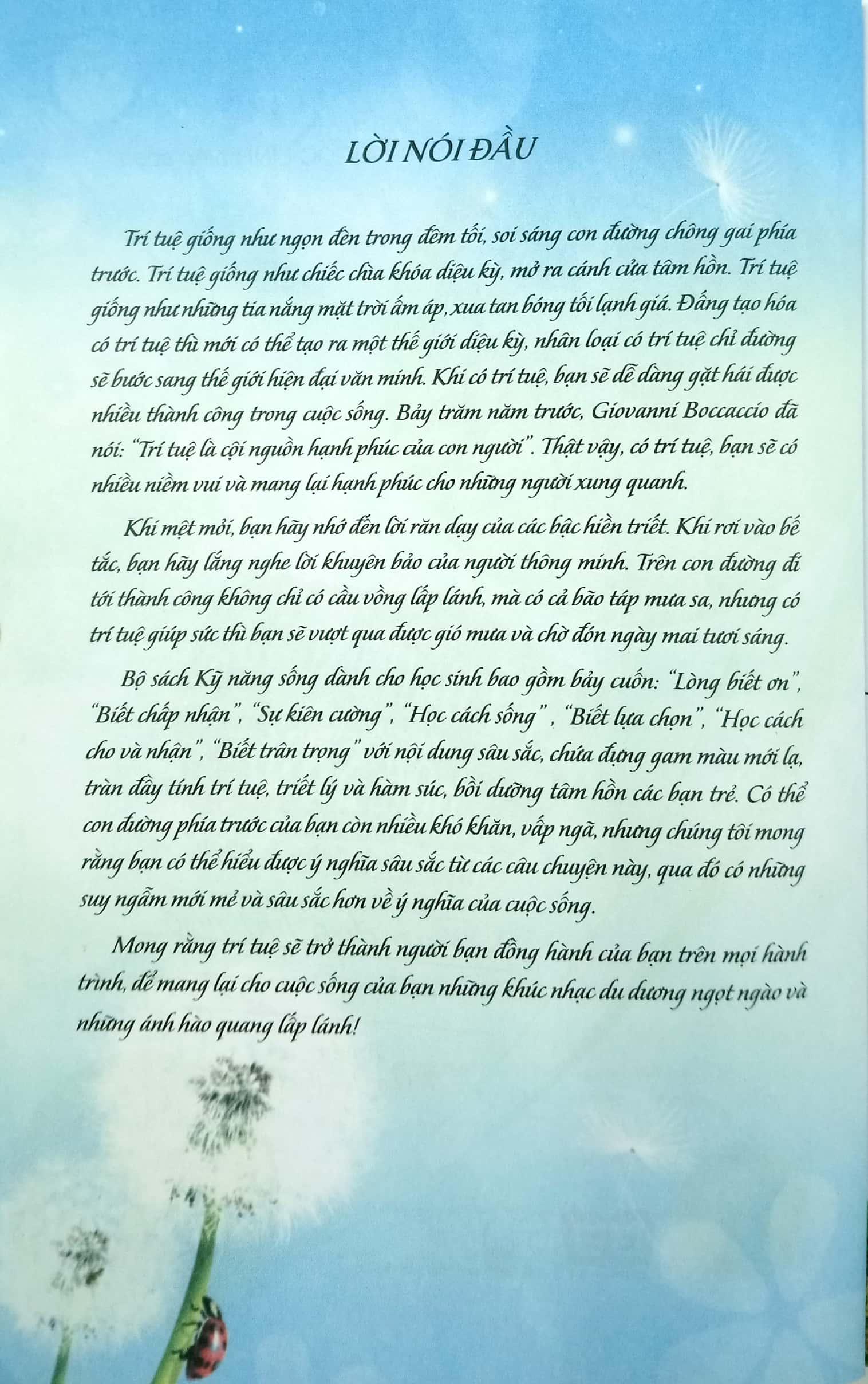 Trí tuệ giống như ngọn đèn xuyên qua đêm tối, soi sáng con đường chông gai phía trước. Trí tuệ giống như chiếc chìa khóa diệu kỳ gợi mở cánh cửa tâm hồn. Trí tuệ giống như những tia nắng mặt trời ấm áp xua tan bóng tối lạnh giá phủ mờ nhân loại. Đấng tạo hóa có trí tuệ mới có thể tạo ra một thế giới diệu kì; nhân loại có trí tuệ chỉ đường sẽ bước sang thế giới hiện đại văn minh. Khi bạn có trí tuệ, bạn sẽ dễ dàng gặt hái được nhiều thành công trong cuộc sống. Bảy trăm năm trước, Giovanni Boccaccio đã nói: “Trí tuệ là cội nguồn hạnh phúc của con người”. Thật vậy, có trí tuệ, bạn sẽ được trải nghiệm niềm vui và mang lại hạnh phúc cho những người xung quanh. Khi mệt mỏi, hãy nhớ đến lời răn dạy của các bậc trí giả. Khi rơi vào đường cùng bế tắc, hãy lắng nghe tiếng lòng của người thông minh. Tôi tin rằng trên con đường đi tới thành công của chúng ta không chỉ có cầu vồng lấp lánh mà có cả mưa gió cản lối nhưng có trí tuệ giúp sức, cuối cùng bạn sẽ vượt qua gió mưa và đến được với ánh sáng mặt trời ấm áp. Chúng tôi đã chọn lựa và tập hợp những câu chuyện nhiều màu sắc, đầy tính trí tuệ, hàm súc và giàu triết lí có tác dụng khích lệ ý chí thành bộ sách “Kỹ năng sống dành cho học sinh” bao gồm bảy cuốn: “Lòng biết ơn”, “Biết chấp nhận”, “Sự kiên cường”, “Học cách sống” , “Biết lựa chọn” , “Học cách cho và nhận”, “Biết trân trọng”. Có thể con đường phía trước của bạn còn nhiều trắc trở, hoặc bị chìm trong bóng tối lạnh giá, nhưng chúng tôi mong rằng bạn có thể hiểu được ý nghĩa sâu sắc từ các câu chuyện này, qua đó có được những suy ngẫm mới mẻ và sâu sắc hơn về ý nghĩa của cuộc sống. Mong rằng trí tuệ sẽ trở thành người bạn đồng hành mãi mãi của bạn trên mọi hành trình để mang lại cho cuộc sống của bạn những khúc nhạc du dương ngọt ngào và những ánh hào quang lấp lánh!
