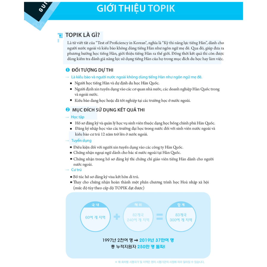 CẨM NANG LUYỆN THI NĂNG LỰC TIẾNG HÀN - TOPIK II TOPIK là kỳ thi năng lực tiếng Hàn được tổ chức tại 76 quốc gia và có đến 375.871 thí sinh khắp thế giới