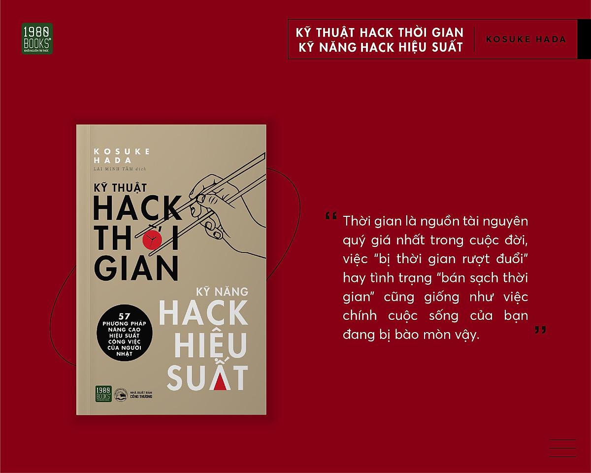 Tác giả: Kosuke HaDa Người dịch: Lại Minh Tâm THÔNG TIN XUẤT BẢN: Kích thước khổ: 13x20,5 Số Trang: 352 Mã EAN: 8936066693714 NXB liên kết: NXB Công Thương Sách do Công ty 1980 BOOKS mua bản quyền và ấn hành quý II/2022 CÔNG TY SÁCH 1980 BOOKS KỸ THUẬT HACK THỜI GIAN, KỸ NĂNG HACK HIỆU SUẤT Thời gian là nguồn tài nguyên quý giá nhất trong cuộc đời, việc “bị thời gian rượt đuổi” hay tình trạng “bán sạch thời gian” cũng giống như việc chính cuộc sống của bạn đang bị bào mòn vậy. “Đôi khi tôi không biết phải làm gì hay bắt đầu từ đâu khi sắp xếp kế hoạch thực hiện công việc của mình”. “Tôi thường xuyên bị người khác “xoay như chong chóng” và cảm thấy vô cùng mệt mỏi”. “Tôi có thể hoàn thành công việc của mình, nhưng so với những người giỏi nhất thì tôi cảm thấy bản thân vẫn còn thiếu một thứ gì đó”. “Mặc dù đã cố hết sức mình nhưng tôi không thể nào hoàn thành nổi công việc nếu không tăng ca”. “Lúc nào trước mặt tôi cũng là cả tá việc, và thật chẳng dễ dàng gì khi phân chia chúng cho cấp dưới của mình”. Nếu bạn đang rơi vào những tình huống như trên và cảm thấy mệt mỏi rã rời, điều bạn đang cần lúc này là phương thức để có thể “xử lý một cách thật hiệu quả mà không cần nhiều nỗ lực”. Hãy bắt đầu sắp xếp lại công việc và cuộc sống của bạn với “Kỹ thuật hack thời gian - Kỹ năng hack hiệu suất”, cuốn sách mang đến những phương thức để có thể xử lý công việc một cách hiệu quả mà không cần phải nỗ lực quá nhiều. =>> Những độc giả nên đọc cuốn sách này: