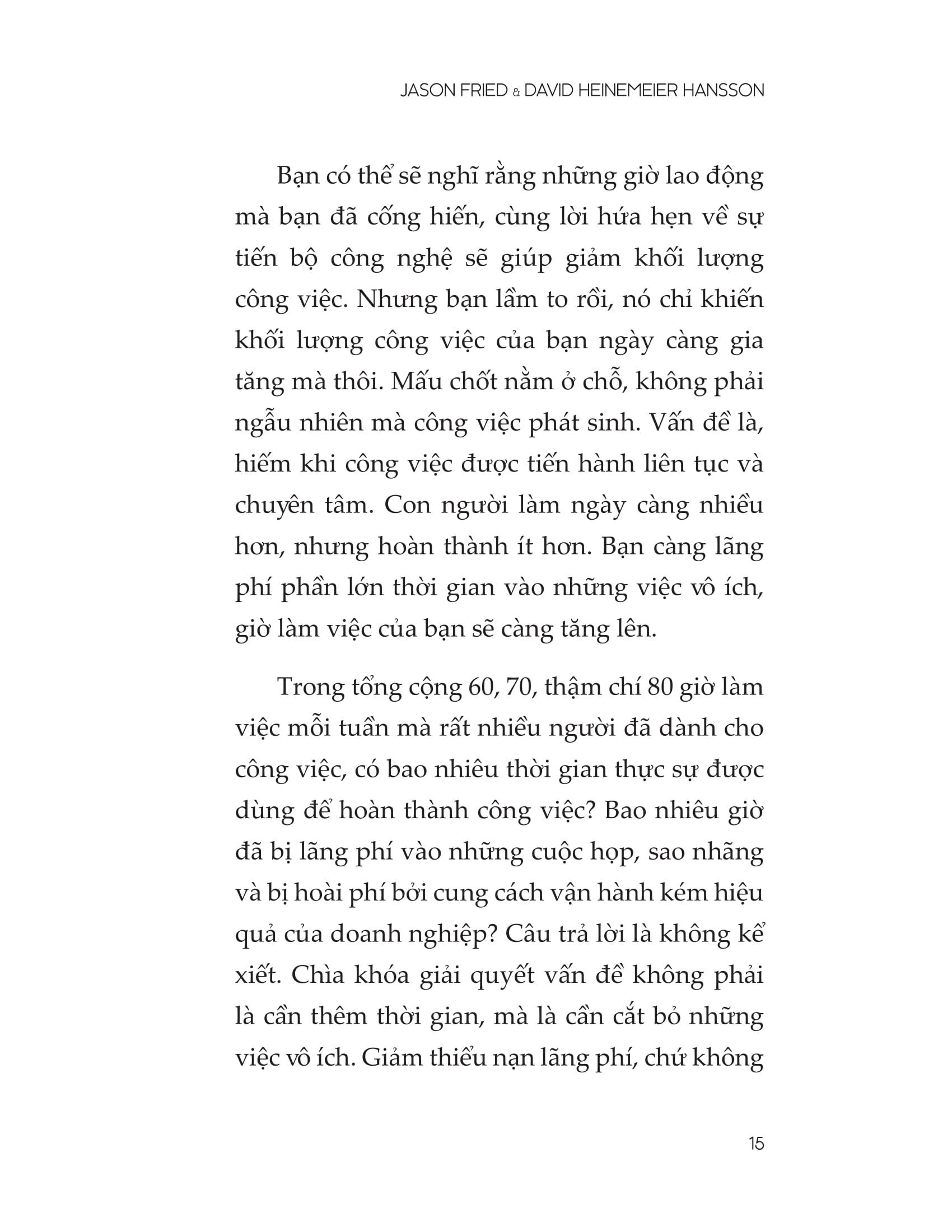 Môi trường làm việc hiện đại là mầm mống dịch bệnh. Sự bát nháo không nên trở thành trạng thái tự nhiên của công việc. Nỗi lo âu không phải là điều kiện tiên quyết cho sự phát triển. Ngồi trong phòng họp cả ngày dài không phải là cách để thành công. Tất cả đều chỉ là sự bóp méo của công việc, là tác dụng phụ của những mô hình khiếm khuyết và việc lạm dụng nó sẽ là con đường ngắn nhất để đẩy công ty đi đến vực thẳm. Hãy thay đổi công ty của mình, đừng đi theo đám đông.