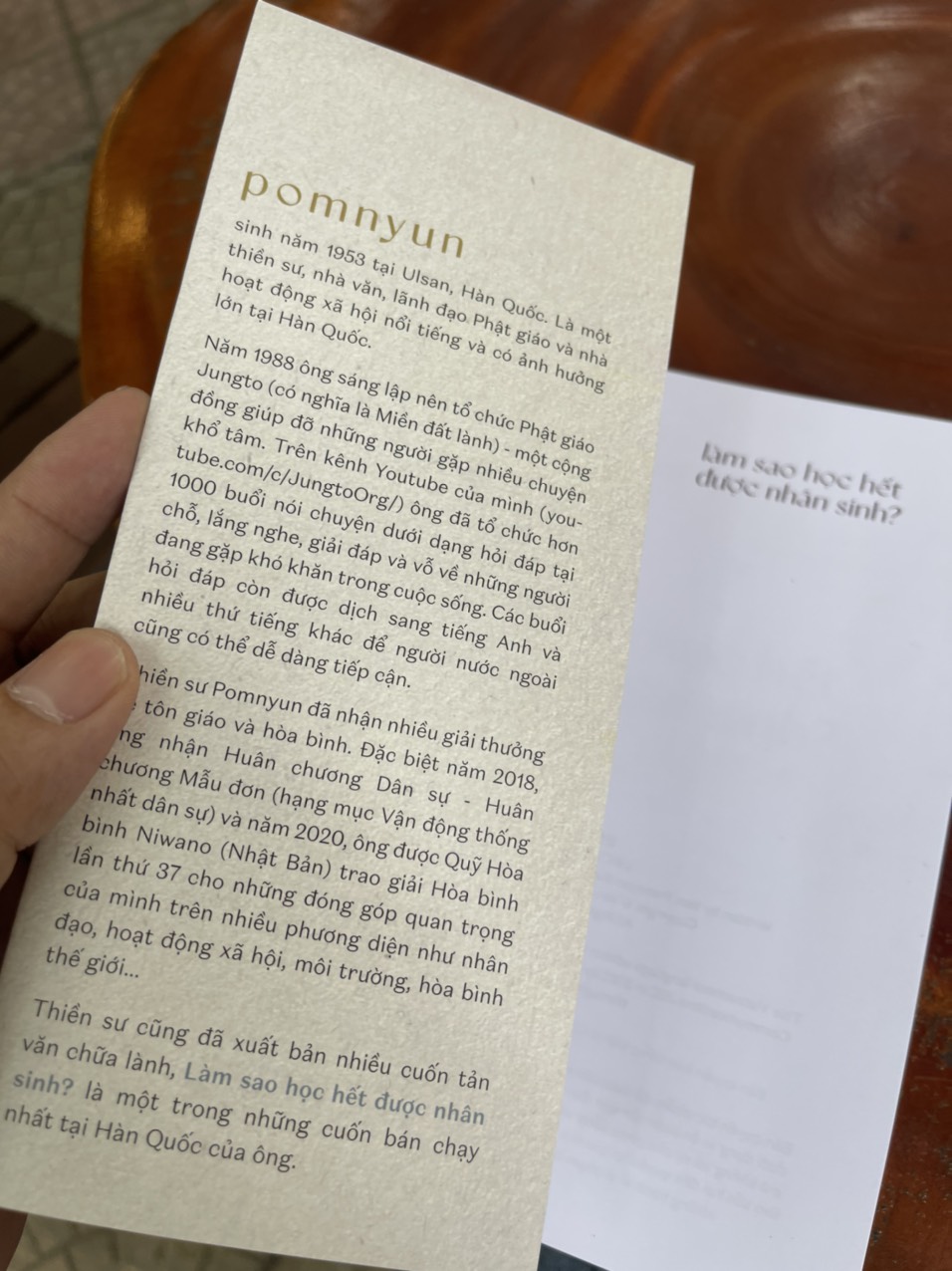 Một cuốn sách không chỉ vỗ về tâm hồn bạn đang tổn thương mà còn thức tỉnh tâm trí bạn vẫn còn mù mờ. Kể từ lần xuất bản đầu tiên năm 2013, Làm sao học hết được nhân sinh? đã nhiều tuần đứng đầu danh sách sách bán chạy và liên tục nằm trong top 10 sách Phật giáo được nhiều người đọc nhất tại Hàn Quốc.