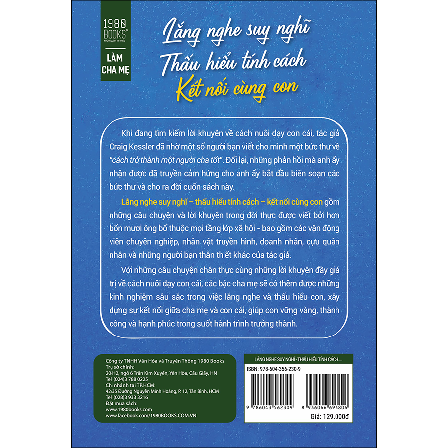 “Lắng nghe suy nghĩ – thấu hiểu tính cách – kết nối cùng con” gồm những câu chuyện và lời khuyên ngoài đời thực được viết bởi hơn 40 ông bố thuộc mọi tầng lớp xã hội – bao gồm: Các vận động viên chuyên nghiệp, nhân vật truyền hình, doanh nhân thành đạt, cựu quân nhân và những người bạn thân thiết khác của tác giả.