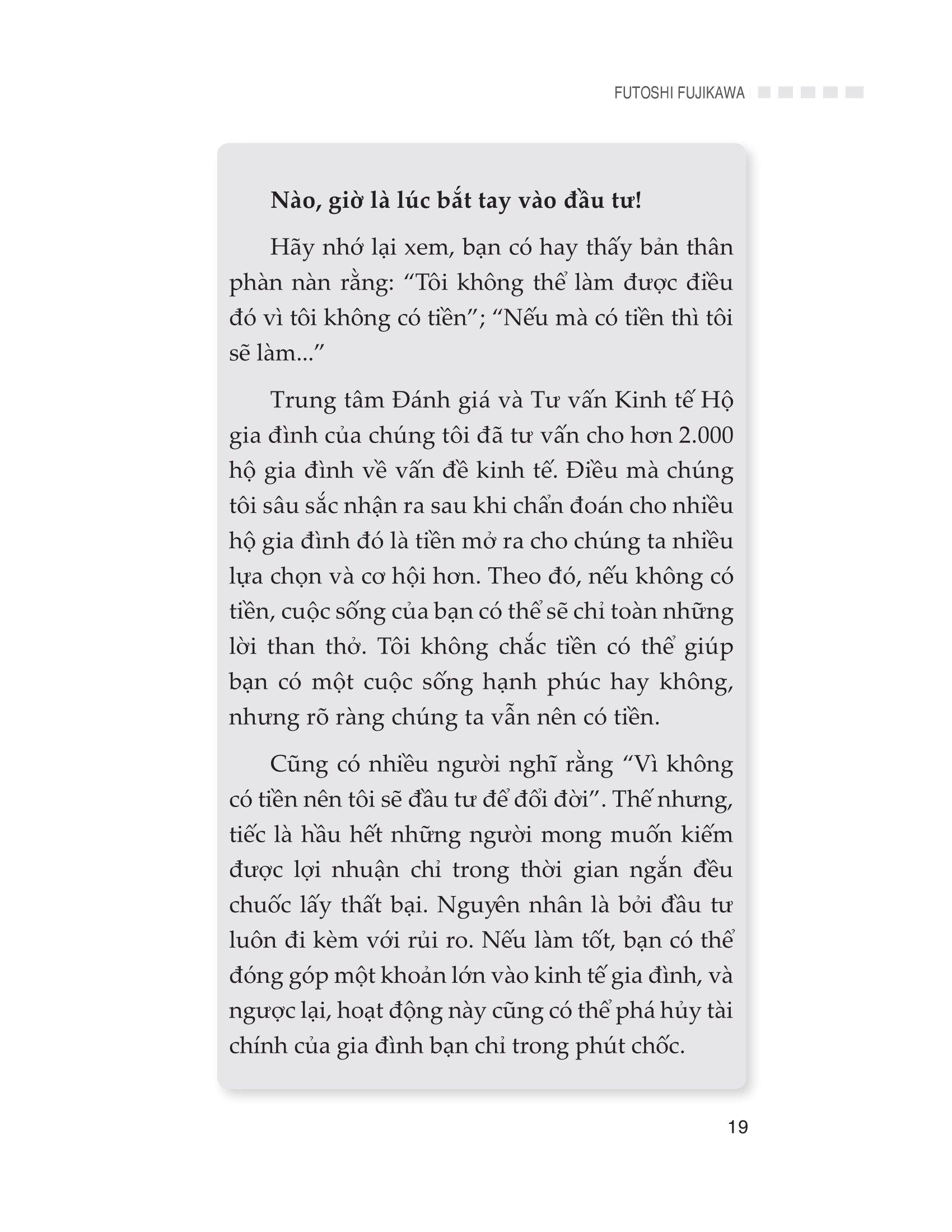 Tác giả Futoshi Fujikawa cũng sẽ giới thiệu một loạt các phương thức hoạt động từ kiến thức cơ bản về tiền tệ đến đầu tư trái phiếu, ủy thác đầu tư, cổ phiếu và ngoại tệ.