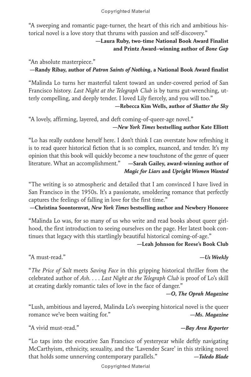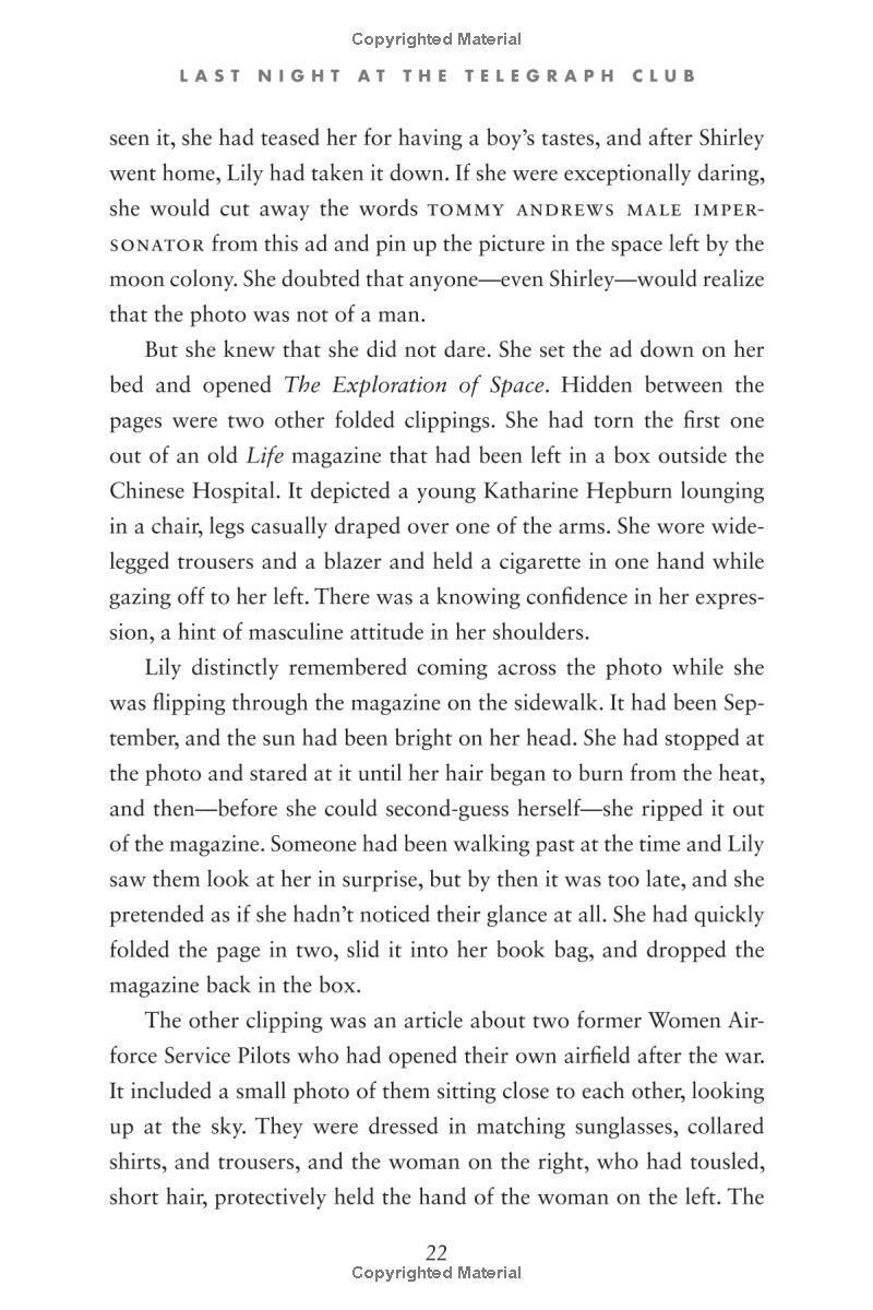 Seventeen-year-old Lily Hu can't remember exactly when the feeling took root—that desire to look, to move closer, to touch. Whenever it started growing, it definitely bloomed the moment she and Kathleen Miller walked under the flashing neon sign of a lesbian bar called the Telegraph Club. Suddenly everything seemed possible.