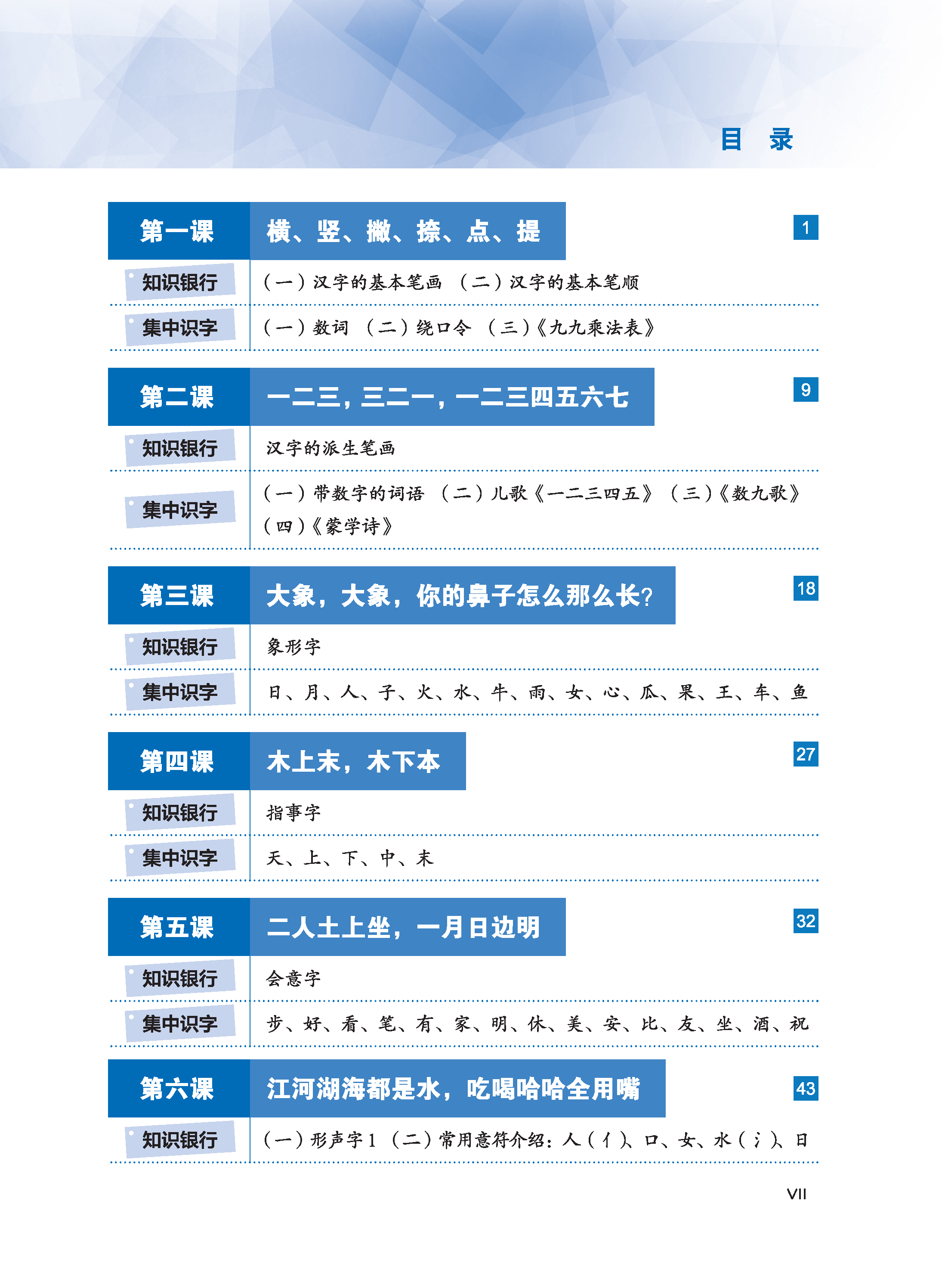 Mảng này giảng giải những tri thức cơ sở về chữ Hán, đồng thời thiết kế phần “Luyện tập” để kiểm tra tình hình lý giải và nắm bắt của học sinh. Phần giảng giải đơn giản, rõ ràng, dễ hiểu, có kèm theo phần dịch tiếng Việt, điều này giúp người học giảm bớt tâm trạng ngại khó khi học chữ Hán, nắm được phương pháp học tập chính xác, nâng cao hứng thú và hiệu suất học tập. Bài 1 và bài 2 chủ yếu giới thiệu về các nét chữ và quy tắc bút thuận của chữ Hán. Bài 3 đến bài 7 giới thiệu về cấu tạo cơ bản của chữ Hán, giảng giải một cách hệ thống về chữ tượng hình, chữ chỉ sự, chữ hội ý và chữ hình thanh; phần chữ hình thanh được chia thành hai bài, một bài chủ yếu giảng giải về ý phù (hình bàng), một bài chủ yếu giảng giải về thanh phù (thanh bàng). Bài 8 giảng giải về ba hiện tượng chữ cận hình, chữ đồng âm và chữ đa âm tồn tại trong tiếng Hán. Bài 9 giới thiệu về mối quan hệ giữa chữ Hán và từ.