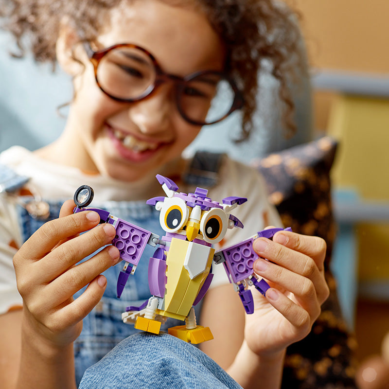Tham gia một chuyến đi sâu vào khu rừng tưởng tượng để có được niềm vui kỳ diệu với các loài động vật trong rừng! Hãy xem một con cú khôn ngoan dạy một chú nhím dễ thương đọc cuốn sách thú vị bằng kính lúp. Sau đó, xây dựng lại chúng thành một chú nai con xinh đẹp và một chú thỏ đang chơi đùa cùng nhau, hoặc một chú sóc táo tợn đang gặm quả sồi. Niềm vui mê mẩn không bao giờ ngừng với bộ lắp ráp 3 trong 1 này.