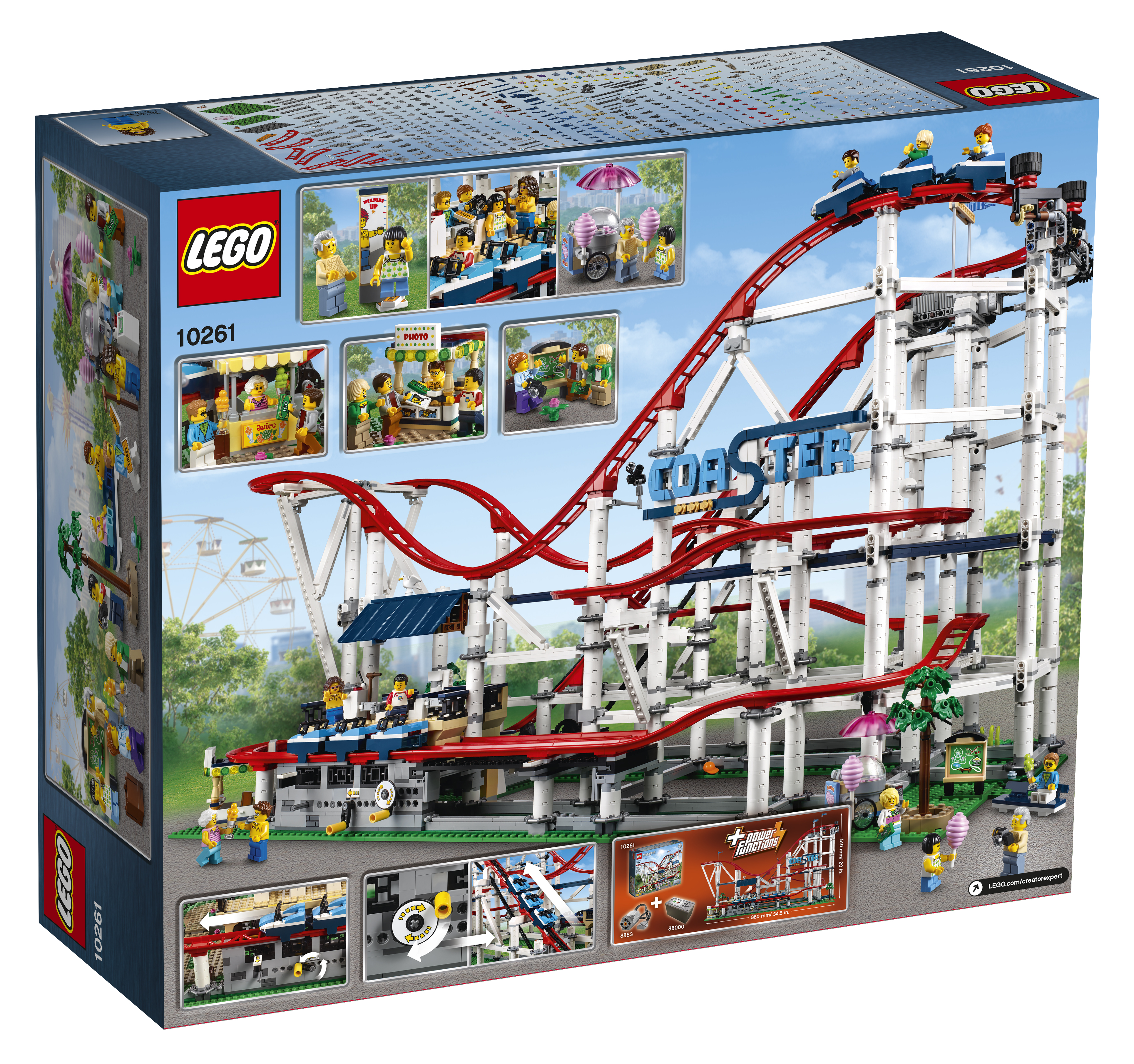- Tàu lượn siêu tốc! Tham gia xếp hàng để nhận vé tham dự điểm tham quan hội chợ LEGO tuyệt vời — Tàu lượn siêu tốc LEGO Creator Expert 10261 tuyệt vời! Đi theo con đường quanh co quanh đài phun nước và mua đồ uống giải khát tại quầy nhượng quyền trước khi bạn bước lên điểm đánh dấu độ cao. Đừng kiễng chân, vì nhân viên phục vụ có gậy để kiểm tra kỹ bạn tại sân ga! Đi qua trạm lên máy bay có mái che, mở rào chắn và leo lên tàu. Đảm bảo cố định thanh vòng trước khi bộ điều khiển khởi động tàu để đưa bạn lăn tới chân của lần leo đầu tiên. Giữ chặt khi xích nâng nắm chặt các toa tàu cho sự đồng ý đầu tiên. Sau đó, nín thở và chuẩn bị hét lên khi bạn lao xuống dốc, qua vô số những khúc quanh co chặt chẽ — nhưng đừng quên mỉm cười trước ống kính! Mua bức ảnh khó quên của bạn từ gian hàng và kể lại chuyến đi ly kỳ khi bạn ghé thăm xe bán kẹo bông. Sau đó nghiên cứu bản đồ công viên giải trí để lên kế hoạch cho chuyến phiêu lưu tiếp theo của bạn. Hay bạn sẽ thử tàu lượn một lần nữa?