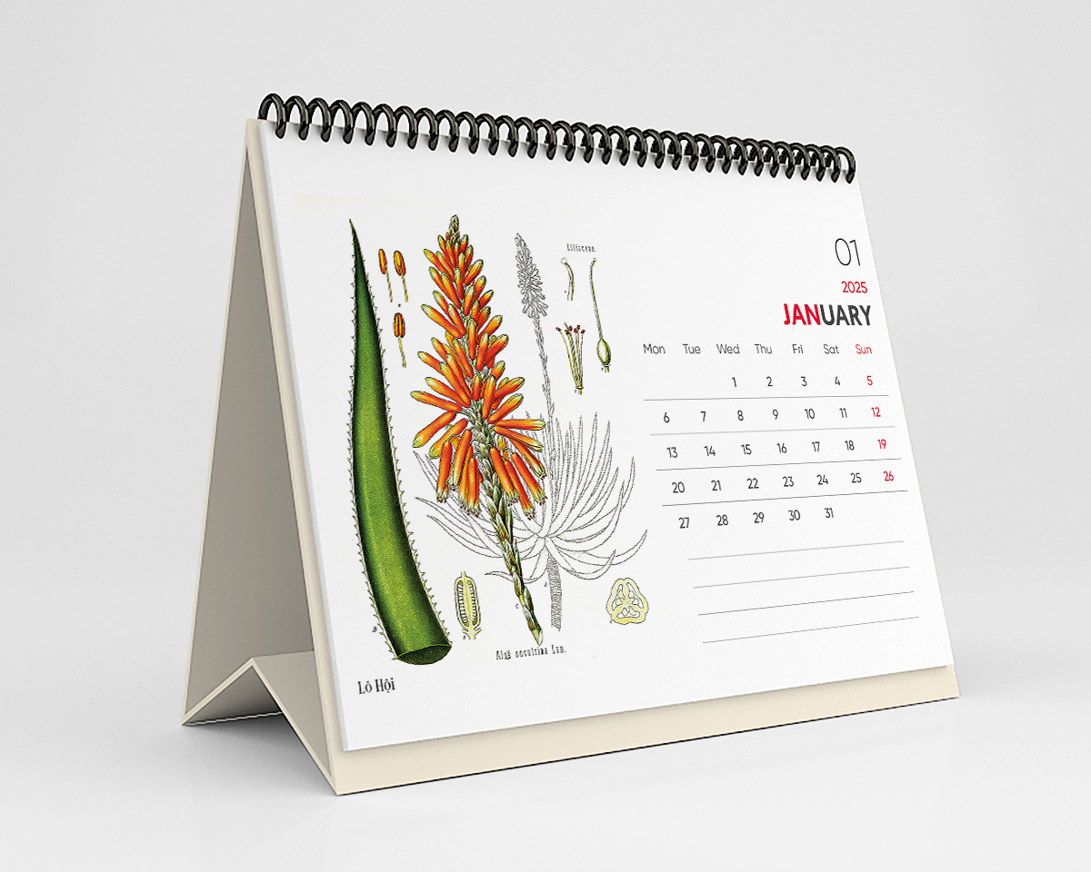 Lịch Bàn 2025 – Wildflower & Herb Khám phá vẻ đẹp tinh khôi của hoa dại và thảo mộc trong suốt cả năm với lịch bàn 2025 chủ đề “Wildflower & Herb.” Được thiết kế dành riêng cho những tâm hồn yêu thiên nhiên, lịch bàn này sẽ biến góc làm việc của bạn thành một không gian bình yên và tràn đầy cảm hứng. Ý tưởng chủ đạo Mỗi tháng là một bức tranh sinh động của những loài hoa dại và thảo mộc. Mỗi loài hoa và cây cỏ đều được lựa chọn kỹ lưỡng để phù hợp với khí hậu và sắc thái của từng mùa trong năm, giúp bạn như được đắm mình trong khu vườn thiên nhiên nhỏ ngay trên bàn làm việc. Những hình ảnh chân thực và sắc nét này sẽ mang đến cảm giác thư giãn, xoa dịu áp lực công việc và gợi nhắc bạn về sự tĩnh lặng, yên bình. Đặc điểm nổi bật: