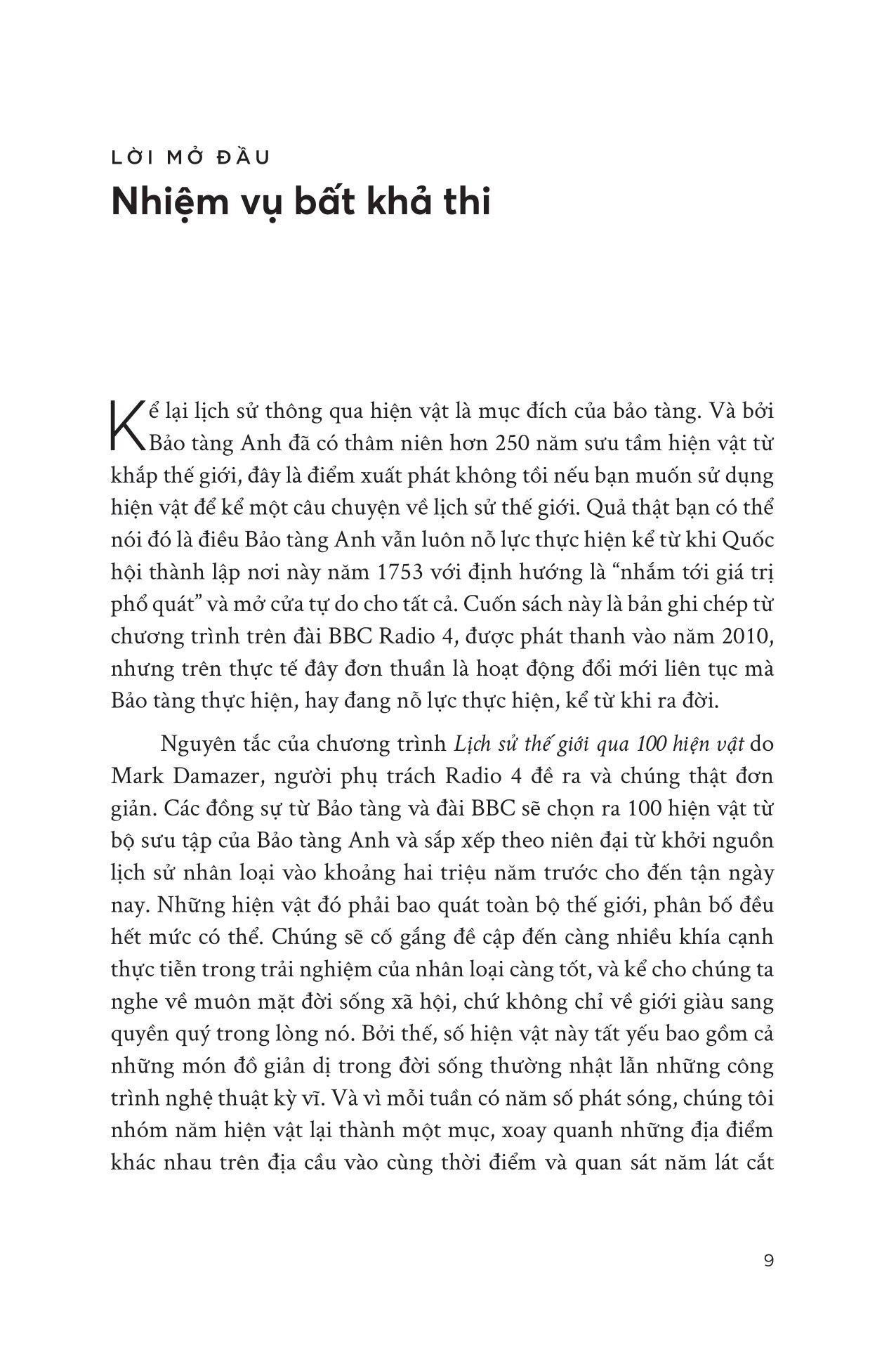 Lịch Sử Thế Giới Qua 100 Hiện Vật được viết bởi Neil MacGregor - Nguyên Giám đốc Bảo tàng Anh (2003-2009) giúp chúng ta hiểu rõ hơn về quá trình phát triển của loài người bằng một góc nhìn mới lạ, đó là qua việc kể những câu chuyện lịch sử hấp dẫn, độc đáo xoay quanh các hiện vật tiêu biểu được trưng bày tại Bảo tàng Anh.