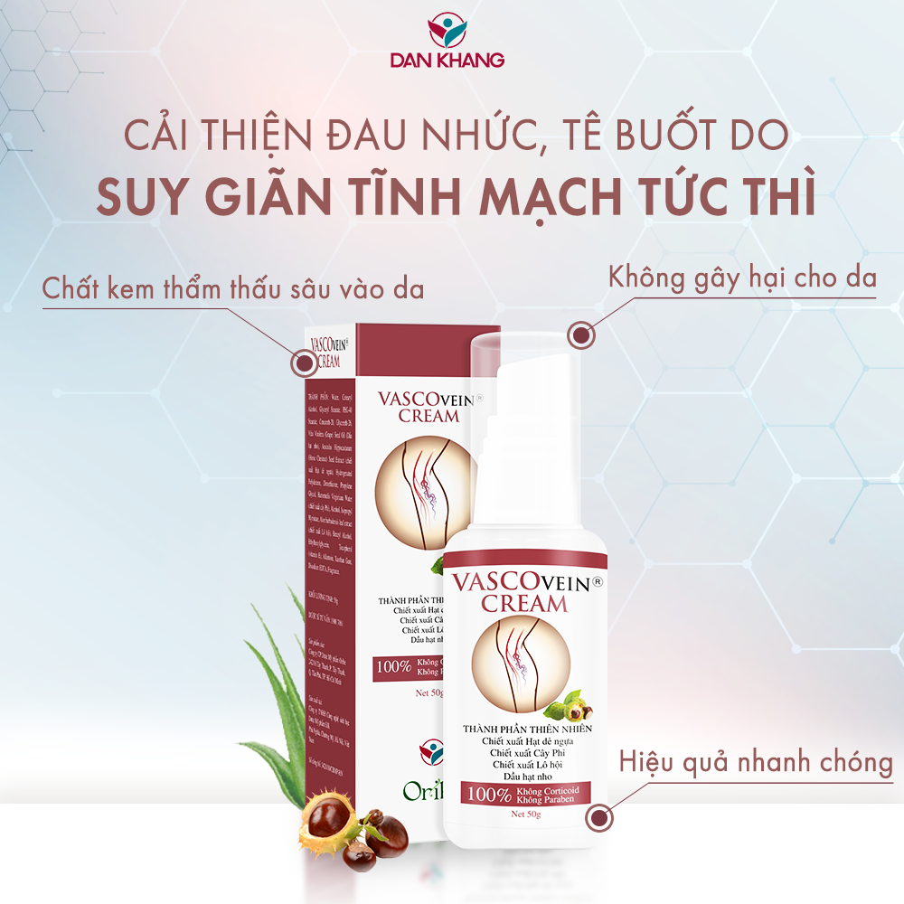 - KEM THOA GIẢM SƯNG ĐAU, TÊ PHÙ, CHUỘT RÚT DO SUY GIÃN TĨNH MẠCH VASCOVEIN Với sự kết hợp của các thành phần thiên nhiên như: chiết xuất Hạt dẻ ngựa, chiết xuất cây Phỉ, chiết xuất Lô hội, Dầu hạt nho, Kem thoa Giảm Sưng Đau, Tê Phù, Chuột Rút do Suy Giãn Tĩnh Mạch Vascovein giúp làm giảm tức thì các triệu chứng khó chịu của bệnh: nặng chân, phù chân, đau nhức, tê chân, chuột rút về đêm, lộ tĩnh mạ Mô tả sản phẩm: Tuýp 50g. Cách dùng: Lấy lượng vừa đủ kem, thoa lên vùng da bị giãn tĩnh mạch và massage trong khoảng 1-2 phút đến khi kem thấm đều. Sử dụng 2-3 lần/ngày. Không bôi lên vết thương hở. ĐỐI TƯỢNG SỬ DỤNG BỘ ĐÔI VIÊN UỐNG VÀ KEM HỖ TRỢ VÀ PHÒNG NGỪA SUY GIÃN TĨNH MẠCH VASCOVEIN