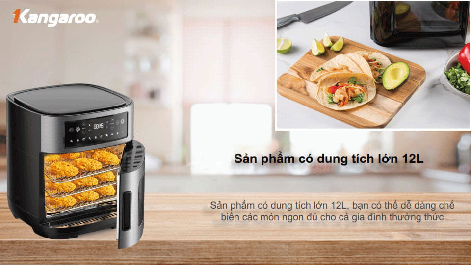 Nồi chiên không dầu có dung tích tổng 12 lít, dung tích sử dụng đến 10 lít có thể nướng gà nguyên con khoảng 1.2 kg.