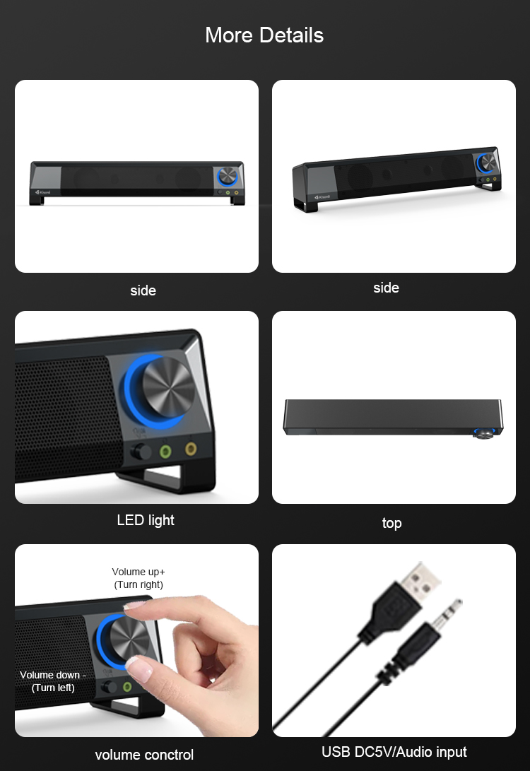 Loại loa: soundbar (dạng thanh hiện đại) Tên Hãng : Kisonli Model : X2 Led ngay nút vặn nguồn Công suất : 3W x 2 (max 3.5W) Kết nối : Jack 3.5mm (âm thanh) +