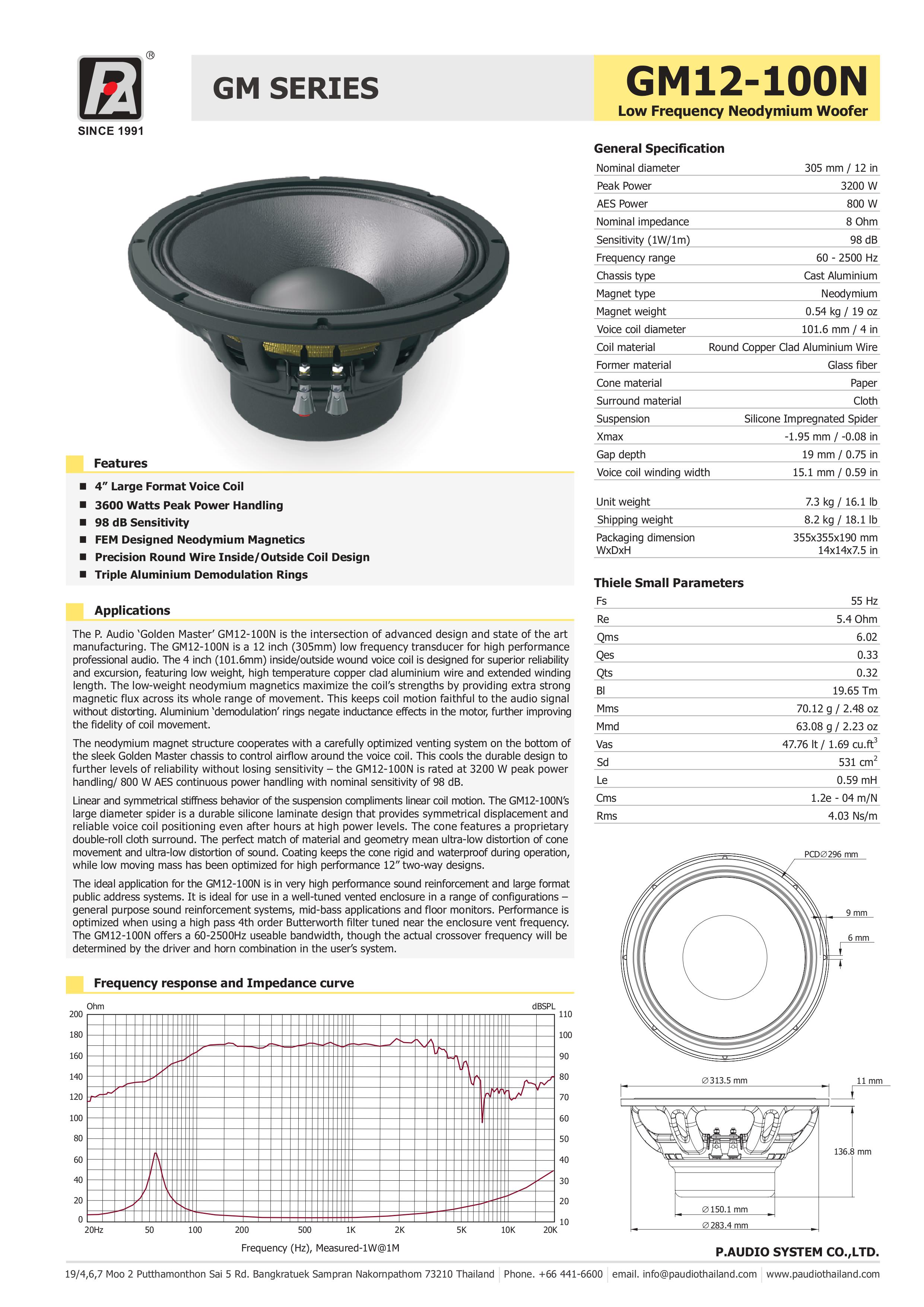 Xuất xứ: Ý Độ nhạy trung bình 97 dB SPL 1W / 1m. 100 mm (4 in) Interleaved Sandwich ISV copper clad voice coil. Công suất 800W. Công suất liên tục 1200W. Công nghệ Double