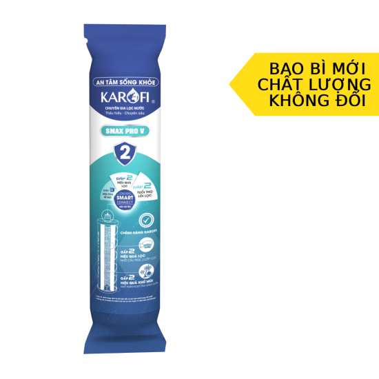 - Thời gian thay lõi khuyến nghị: 12 tháng Tổng quan về lõi Smax Pro V2 Không chỉ nhân đôi tuổi thọ, gấp đôi hiệu quả; hệ lõi Smax Pro V còn đột phá hơn với công nghệ Smart Connect, an tâm chính hãng, kết nối thông mình đem lại những trải nghiệm vượt trội. Cấu tạo 2 lớp đặc biệt Điểm đặc biệt của công nghệ Smax Pro V đến từ cấu tạo 2 chức năng kết hợp: Bên ngoài là màng vi lọc gồm các chuỗi vi sợi liên kết kích thước nhỏ kết hợp với than hoạt tính bên trong. Lợi ích các lớp Cụ thể, màng vi lọc ở lớp ngoài giúp loại bỏ các tạp chất, cặn bẩn, rong rêu,... Bên trong là than hoạt tính giúp nâng cao xử lý kép cả các chất hữu cơ, chất gây mùi, chất tạo màu, mùi clo có trong nước sinh hoạt hàng ngày.