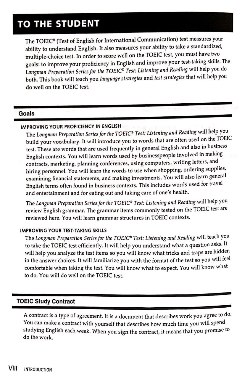 Longman Preparation Series for the TOEIC Test: Listening and Reading, Advanced Course, gives students the skills, strategies, practice, and confidence they need to increase their scores on the Listening and Reading, sections of TOEIC test. Ideal for a TOEIC test preparation course or for self-study, the Advanced Course is intended for student who achieve TOEIC test scores from 500 to 900. Features of New Edition - Three complete Pratice Tests include updated TOEIC test-style answer sheets for diagnosis and assessment. - 1000+ practice items reflect the actual format and content of the most recent TOEIC test. - Language Strategies and Test Strategies in each section help learners to focus on skills and set goals. - Highlighted Test Taking Tips provide grammatical explanations plus links to specific exercises for immediate help and reinforcement. - New Grammar Tips and Vocabulary Tips. - Complete Support containing answer key, complete MP3 files, and audiocripts helps students practice Listening Comprehension exercises and Listening Practice Test questions on their own .