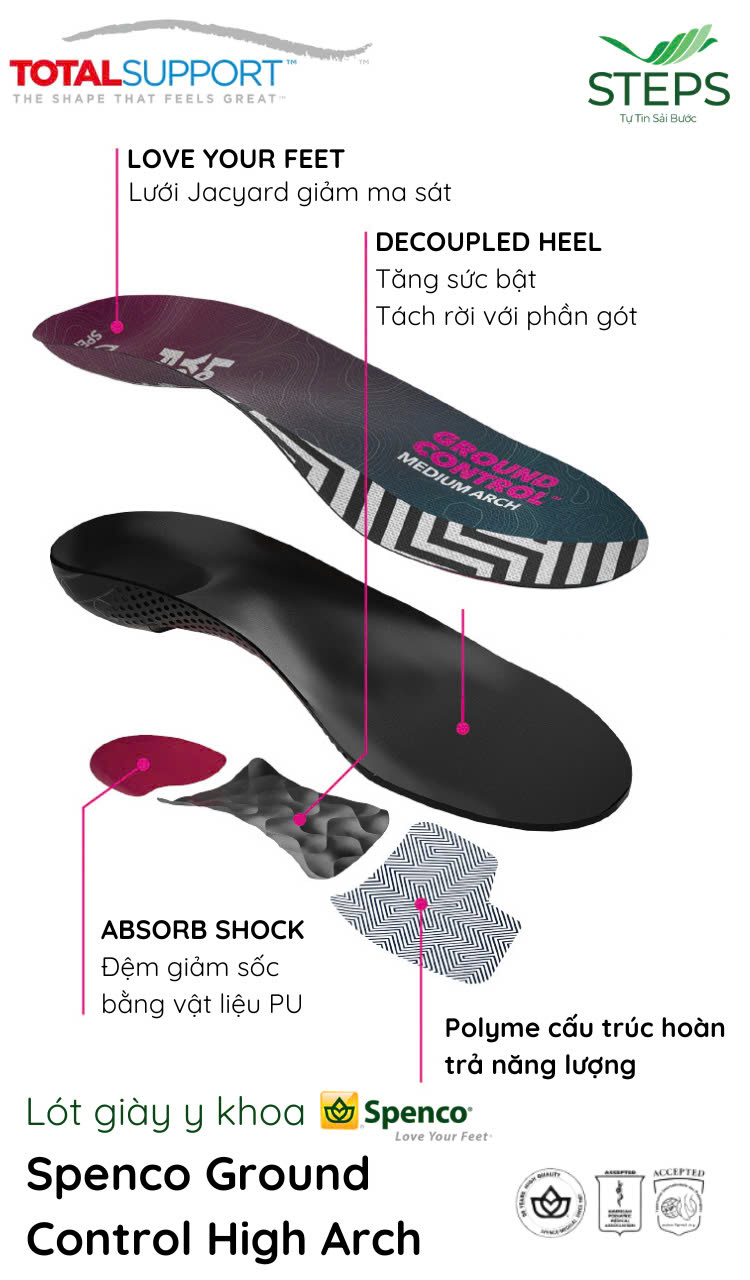 Lót giày y khoa Spenco Ground Control High Arch Thiết kế đặc biệt, cải tiến mới của Spenco Total Support, đế chỉnh hình Spenco Ground Control với cấu trúc nâng linh hoạt ôm sát