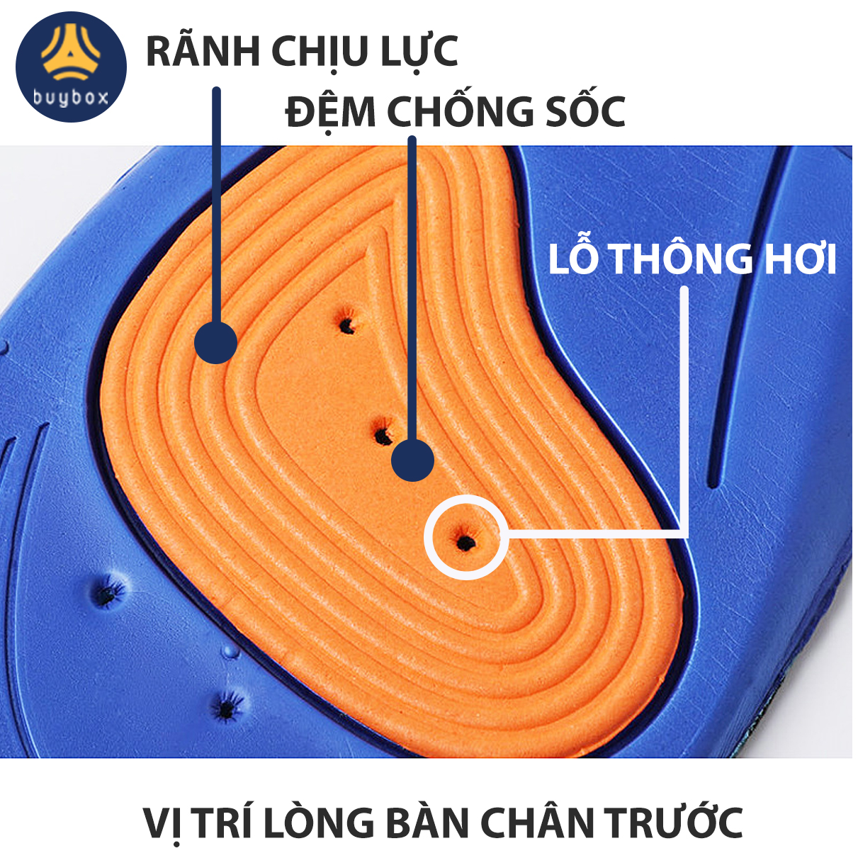Lót giày thể thao EVA có 2 đệm chống sốc ở 2 vị trí quan trọng là gót và lòng bàn chân dưới các ngón, giảm áp lực lên các huyệt đạo, mô cơ.