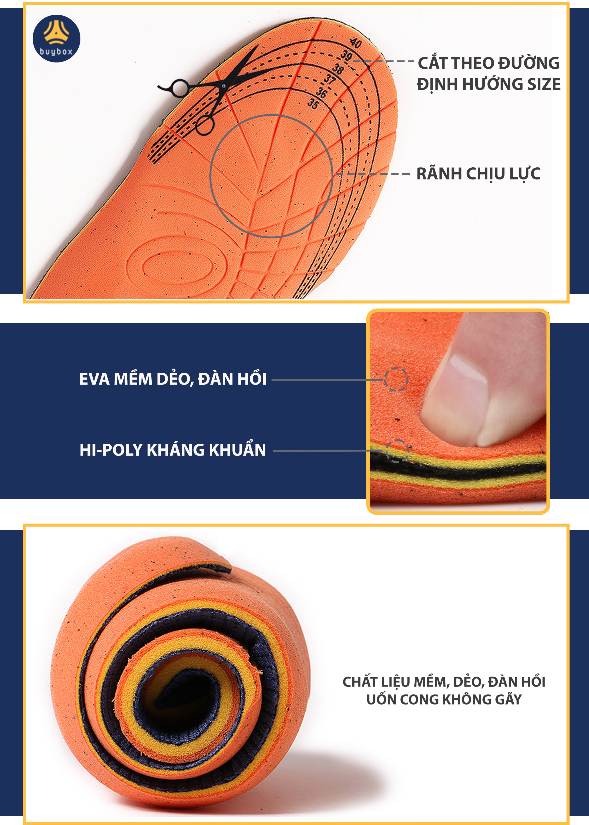Sử dụng Lót giày thể thao EVA với 6 gờ chống sốc và rãnh chịu lực của buybox đệm êm bàn chân, giảm tổn thương lên chân.