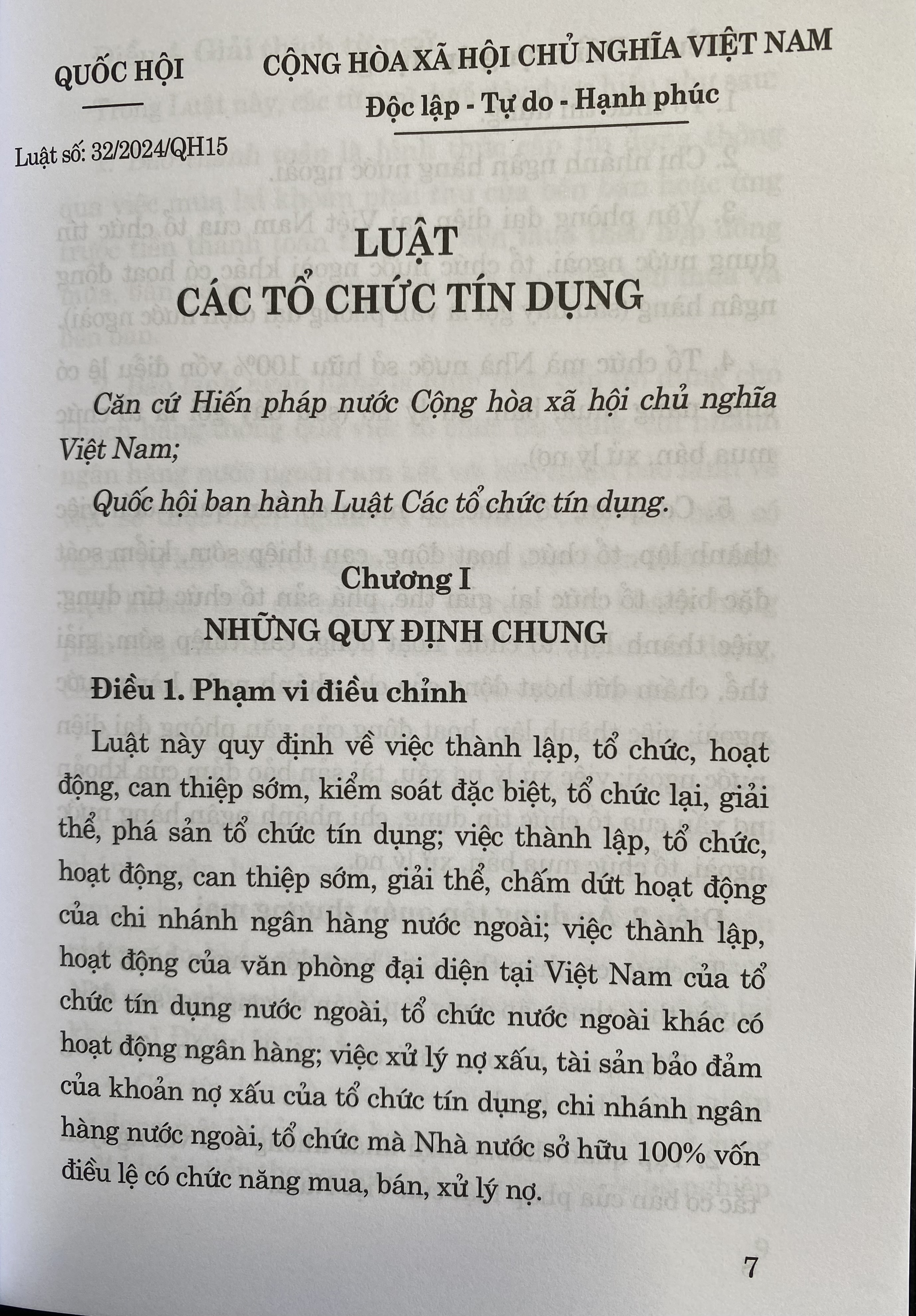 Mua tại TiktokLuật Các Tổ Chức Tín Dụng 32/2024/QH15 ( Luật có hiệu lực thi hành từ ngày 01-07-2024 ) Luật này quy định về việc thành lập, tổ chức, hoạt động, can thiệp sớm, kiểm soát đặc biệt, tổ chức lại, giải thể, phá sản tổ chức tín dụng; việc thành lập, tổ chức, hoạt động, can thiệp sớm, giải thể, chấm dứt hoạt động của chi nhánh ngân hàng nước ngoài; việc thành lập, hoạt động của văn phòng đại diện tại Việt Nam của tổ chức tín dụng nước ngoài, tổ chức nước ngoài khác có hoạt động ngân hàng; việc xử lý nợ xấu, tài sản bảo đảm của khoản nợ xấu của tổ chức tín dụng, chi nhánh ngân hàng nước ngoài, tổ chức mà Nhà nước sở hữu 100% vốn điều lệ có chức năng mua, bán, xử lý nợ.