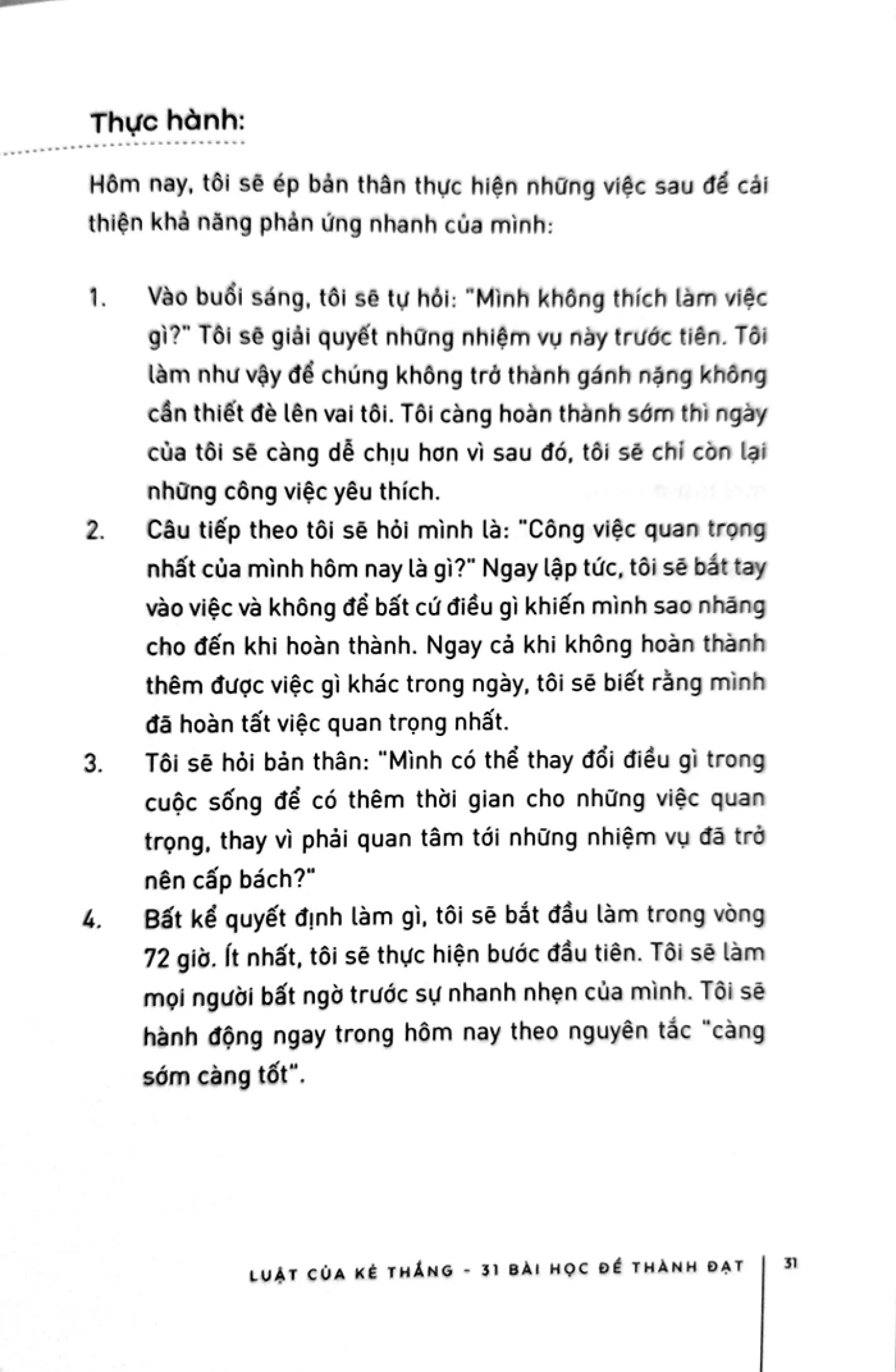 Và trong cuốn sách này, tác giả cung cấp cho chúng ta bộ quy tắc căn bản để đạt được điều ấy. Tất nhiên, để thoát khỏi mê lộ của sợ hãi, trì hoãn và thiếu động lực hòng gây dựng một tương lai tươi sáng, ta phải tuân thủ những quy tắc ấy với quyết tâm sắt đá, và ta sẽ: