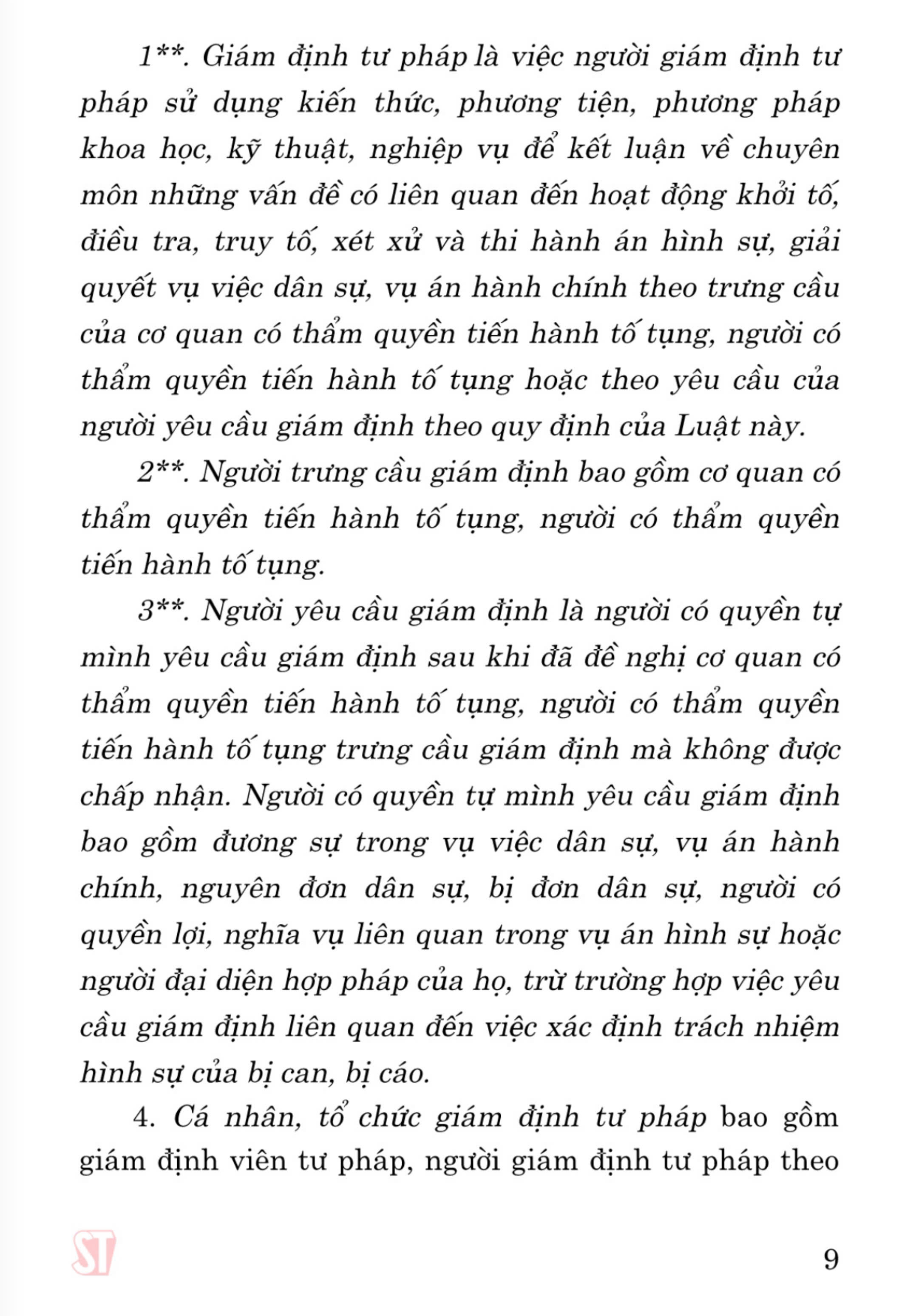 Luật Giám định tư pháp (hiện hành) (sửa đổi, bổ sung năm 2018, 2020) gồm 7 chương, 46 điều, quy định về: giám định viên tư pháp; tổ chức giám định tư pháp; người giám định tư pháp theo vụ việc, tổ chức giám định tư pháp theo vụ việc; hoạt động giám định tư pháp; chi phí giám định tư pháp, chế độ, chính sách trong hoạt động giám định tư pháp và trách nhiệm của cơ quan nhà nước đối với tổ chức, hoạt động giám định tư pháp. Luật Giám định tư pháp được Quốc hội khóa XIII, kỳ họp thứ 3 thông qua ngày 20/6/2012 và được sửa đổi, bổ sung vào các năm 2018, 2020. Cuốn sách Luật Giám định tư pháp (hiện hành) (sửa đổi, bổ sung năm 2018, 2020) là văn bản luật hợp nhất của Luật Giám định tư pháp năm 2012 và các nội dung của hai lần sửa đổi tạo thành một văn bản Luật Giám định tư pháp thống nhất hiện hành và mới nhất thuận tiện trong sử dụng tra cứu tham khảo.