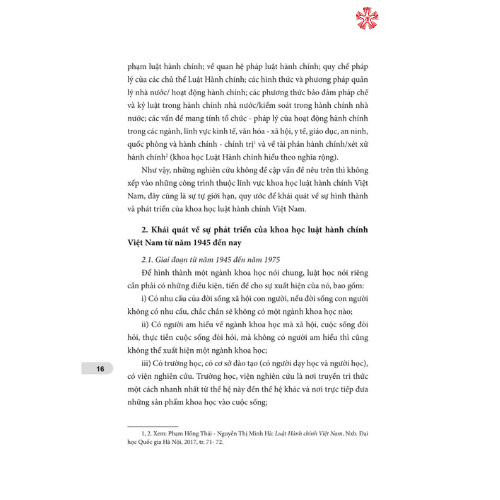 Mua tại TiktokCuốn sách Luật Hành chính Việt Nam: Từ truyền thống đến Nhà nước pháp quyền xã hội chủ nghĩa do PGS.TS. Vũ Công Giao, PGS.TS. Nguyễn Quốc Sửu, PGS.TS. Đặng Minh Tuấn (Đồng chủ biên) góp phần đáp ứng yêu cầu đó. Cuốn sách được chia thành hai phần: Phần 1 gồm một số bài viết đề cập sự phát triển của Luật Hành chính, khoa học Luật Hành chính Việt Nam từ trước tới nay, bao gồm một số vấn đề lý luận, thực tiễn đang đặt ra với sự phát triển của ngành luật này. Phần 2 gồm những bài viết đề cập nhiều nội dung của Luật Hành chính mà cần cải cách, hoàn thiện để thực hiện các mục tiêu, nhiệm vụ có liên quan trong Nghị quyết số 27-NQ/TW.