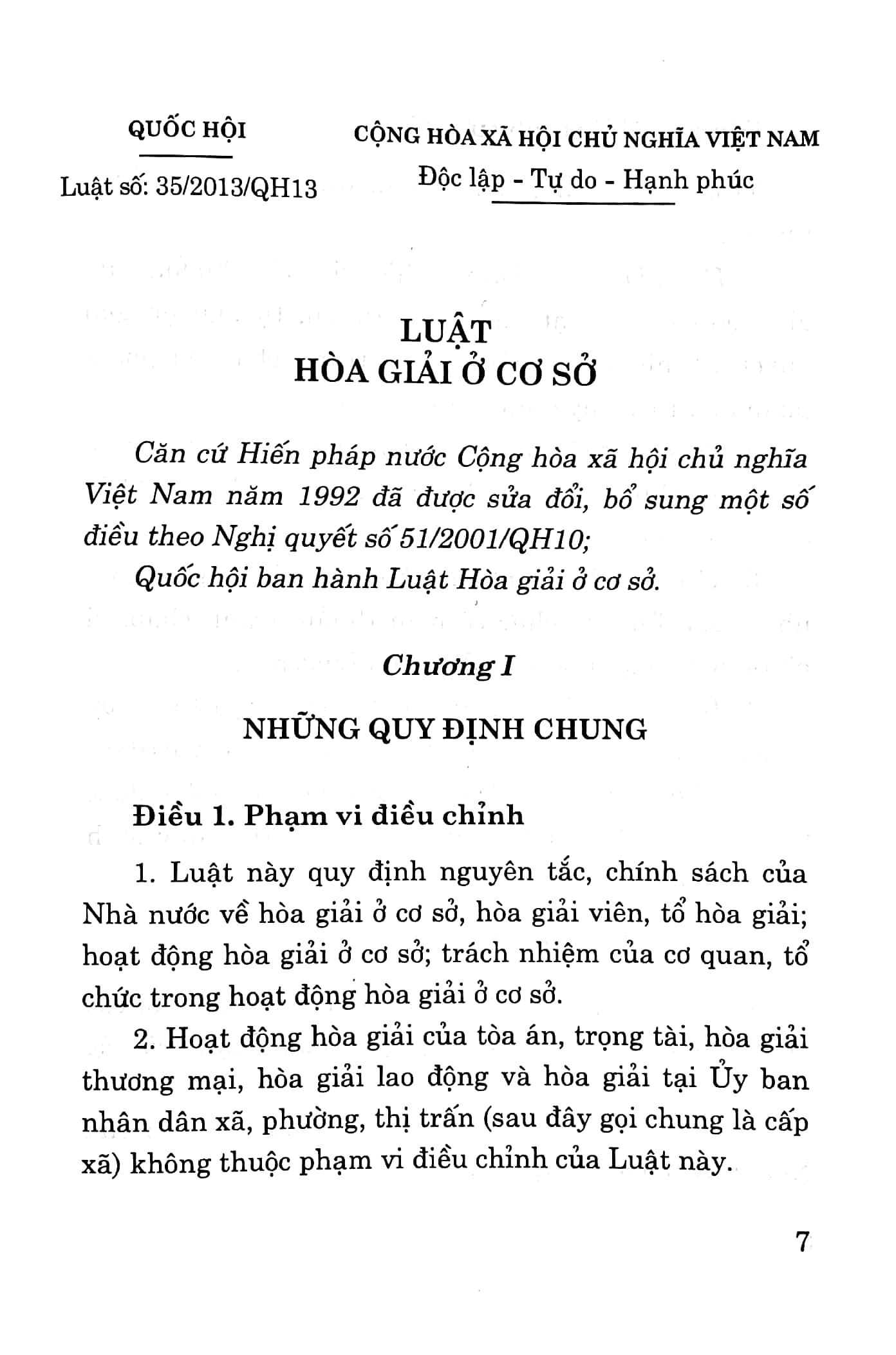 Luật Hòa Giải Ở Cơ Sở (Hiện Hành) Luật Hòa giải ở cơ sở (hiện hành) được Quốc hội nước Cộng hòa xã hội chủ nghĩa Việt Nam khóa XIII, kỳ họp thứ 5 thông qua ngày 20/6/2013, có hiệu lực thi hành từ ngày 01/01/2014. Luật gồm 5 chương, 33 điều, quy định nguyên tắc, chính sách của Nhà nước về hòa giải ở cơ sở, hòa giải viên, tổ hòa giải; hoạt động hòa giải ở cơ sở; trách nhiệm của cơ quan, tổ chức trong hoạt động hòa giải ở cơ sở.