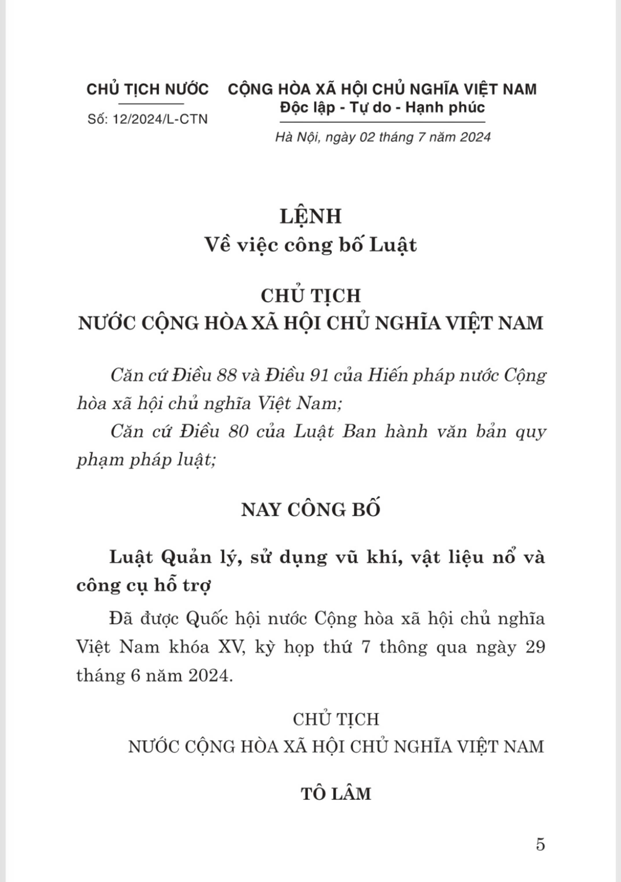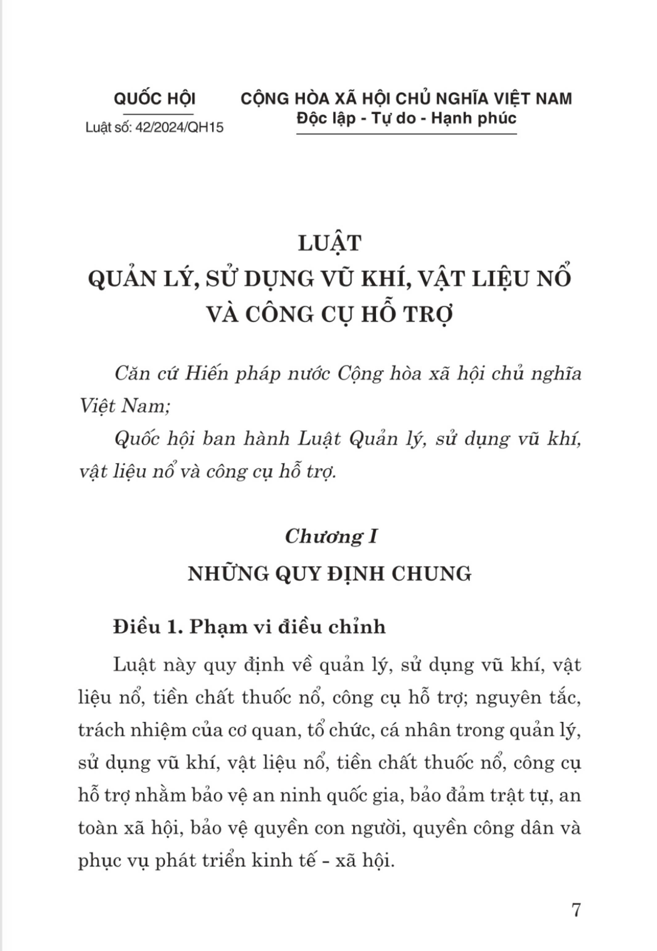 Luật Quản lý, sử dụng vũ khí, vật liệu nổ và công cụ hỗ trợ (sửa đổi) được Quốc hội thông qua gồm 8 chương, 75 điều.