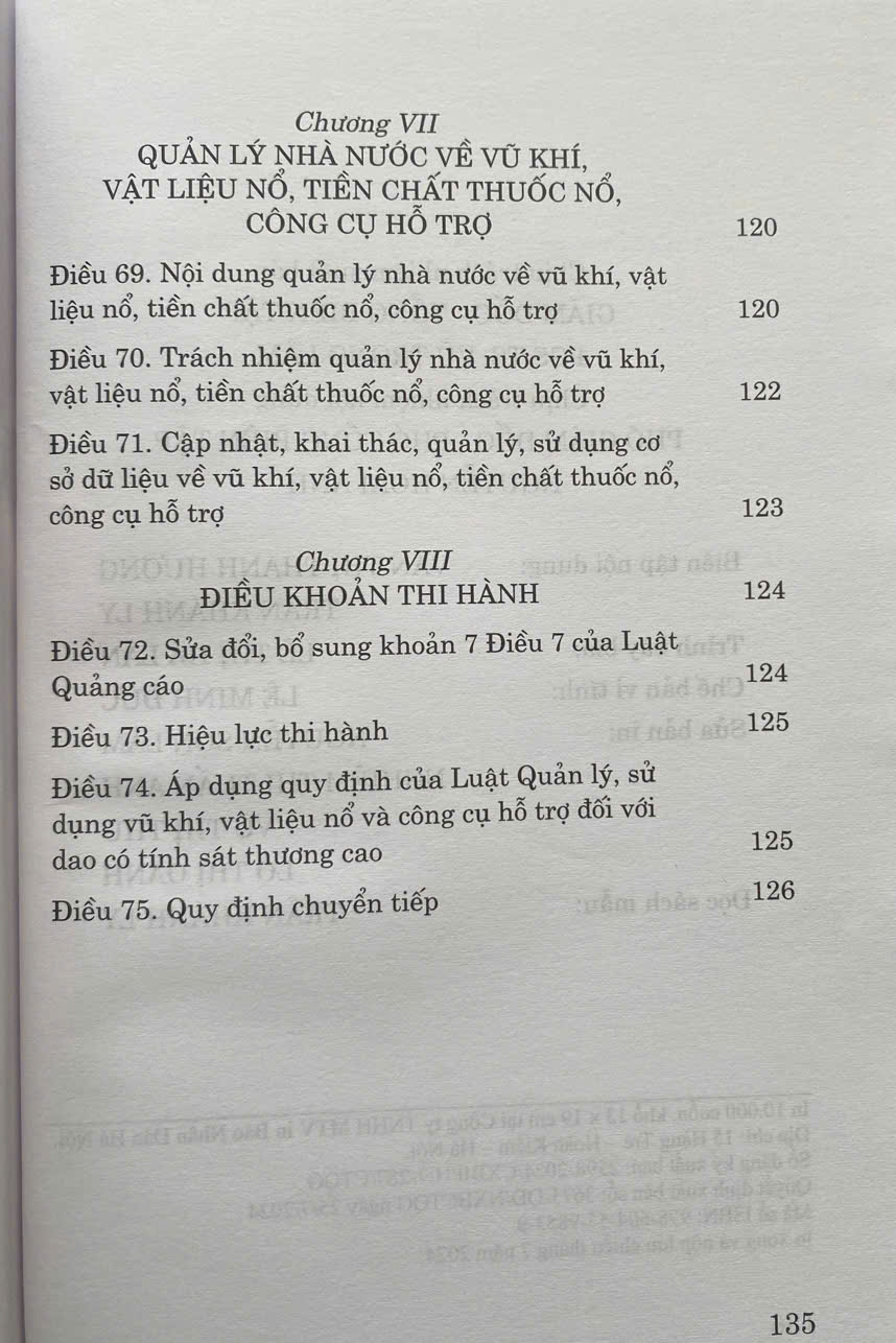 Mua tại TiktokLuật Quản Lý, Sử Dụng Vũ Khí, Vật Liệu Nổ Và Công Cụ Hỗ Trợ số 42/2024/QH15 đã được Quốc Hội khoá XV thông qua ngày 29-06-2024. Luật gồm có 8 chương, 75 điều . Luật có hiệu lực áp dụng từ ngày 01-01-2025