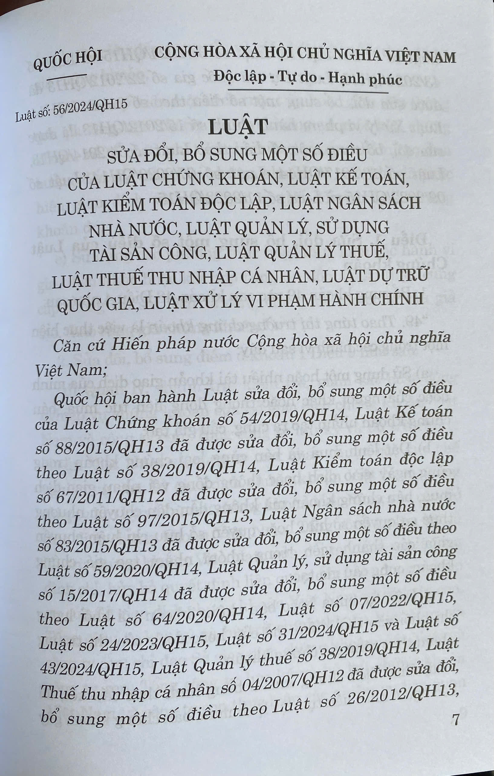Luật Sửa Đổi, Bổ Sung Một Số Điều Của Luật Chứng Khoán, Luật Kế Toán, Luật Kiểm Toán Độc Lập, Luật Ngân Sách Nhà nước, Luật Quản Lý, Sử Dụng Tài Sản Công, Luật Quản Lý thuế, Luật Thuế Thu Nhập Cá Nhân, Luật Dự Trữ Quốc Gia, Luật Xử Lý Vi Phạm Hành Chính số 56/2024/QH15 đã được Quốc Hội khoá XV thông qua ngày 29 tháng 11 năm 2024. Luật gồm có 11 điều. Luật có hiệu lực từ ngày 01 tháng 01 năm 2025